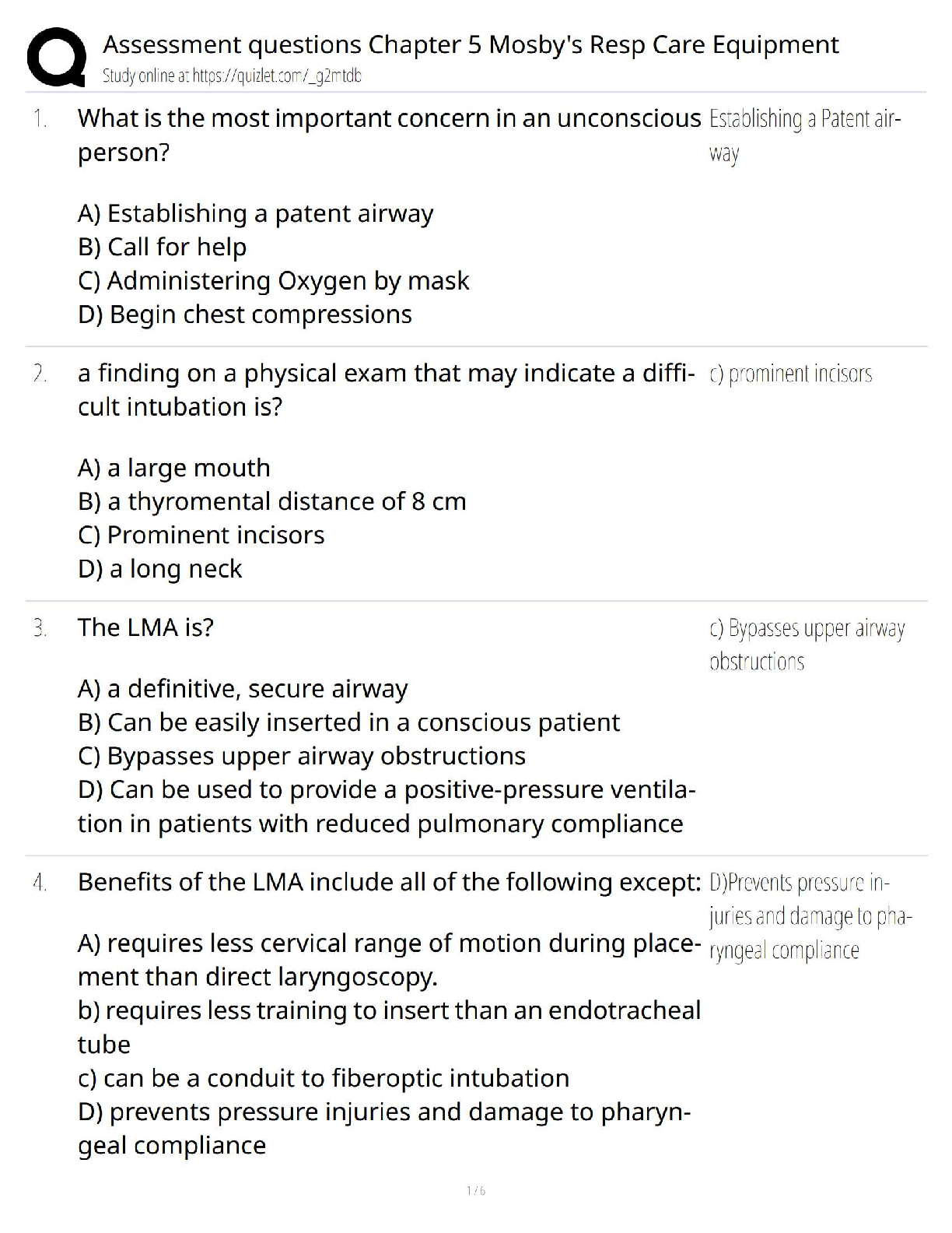 Unlock academic success with the official Test Bank for Chapter 5 of 'Mosby's Respiratory Care Equipment,' 11th Edition, authored by J. M. Cairo. This downloadable resource provides a complete set of exam-style questions and detailed answers, covering crucial topics such as establishing a patent airway, difficult intubation indicators, and the use of Laryngeal Mask Airways (LMA). Perfect for students aiming to ace their exams, this test bank allows you to practice with the exact questions you'll see on your tests, ensuring you master the concepts and are fully prepared. Get instant access to this invaluable study tool and take the first step towards achieving top grades in your respiratory care program.