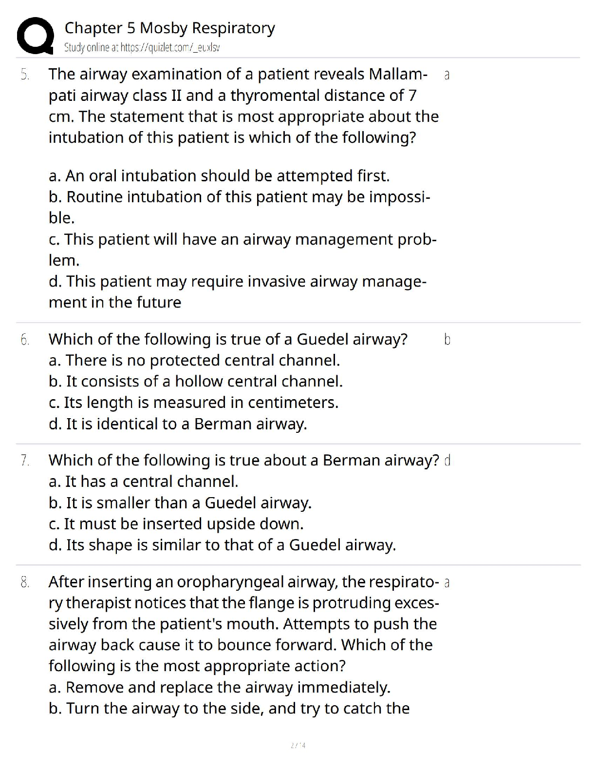 Access the complete Chapter 5 Test Bank for the 11th Edition of Mosby's Respiratory Care Equipment by J. M. Cairo. This resource provides a comprehensive collection of multiple-choice questions with verified answers, covering essential topics in respiratory care and airway management. Perfect for students preparing for exams, this test bank helps you master the course material, identify areas for improvement, and build confidence for your assessments. Instant download available to start your study session right away.