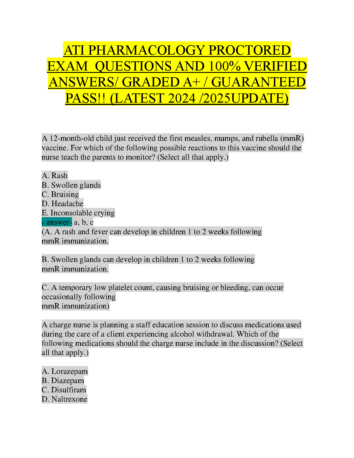 Unlock your A+ potential with our latest 2024/2025 edition of the ATI Pharmacology Proctored Exam Test Bank. This comprehensive resource is expertly compiled with 100% verified questions and detailed answers, mirroring the format and difficulty of the actual exam. Covering a wide range of essential pharmacology topics, from vaccine reactions in pediatrics to medication management for alcohol withdrawal, this guide provides everything you need to study effectively. Designed to ensure you pass on your first attempt, our test bank eliminates exam anxiety and helps you master the material with confidence. Get the grade you deserve and take the next step in your nursing career without the stress of resits.
