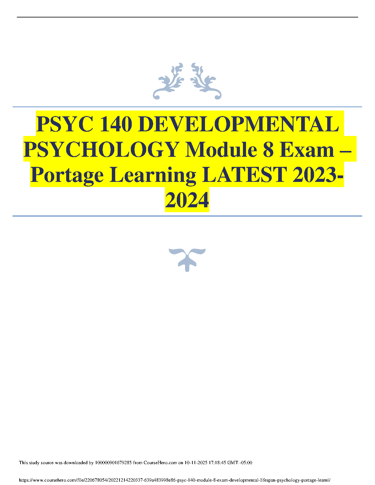 Test Bank for PSYC 140 Developmental Psychology, Module 8 Exam - Portage Learning | Verified Questions & Answers, 2023-2024 Edition