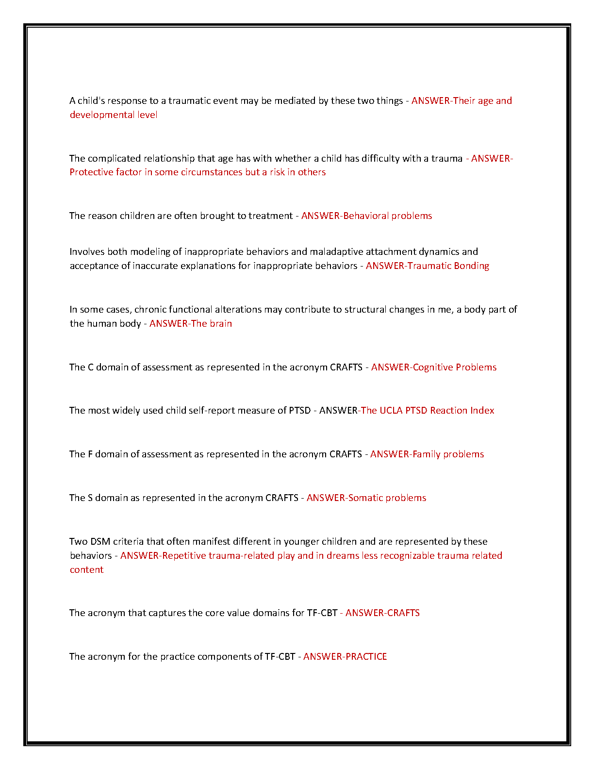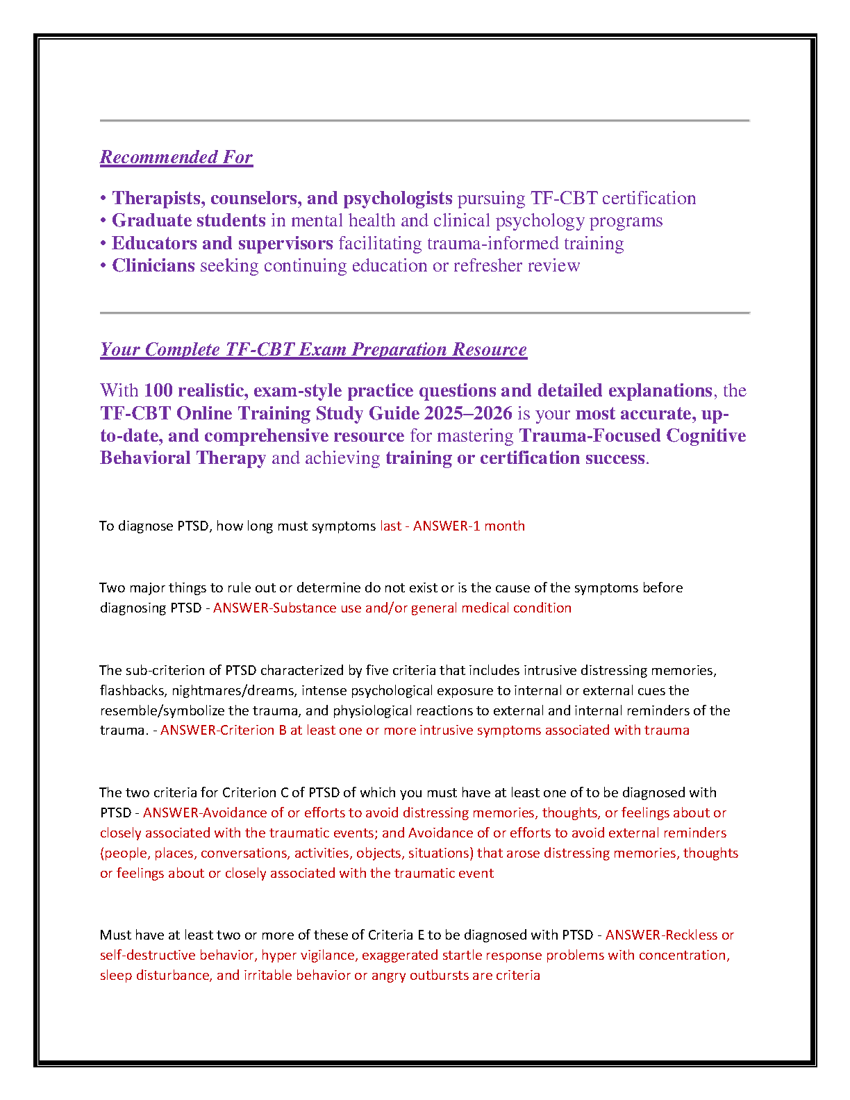 Master the TF-CBT Online Training Exam and achieve certification with confidence using this premium test bank, ideal for mental health professionals, students, and clinicians. This comprehensive resource for the 2025-2026 academic year features 100 meticulously crafted practice questions with detailed, verified answers and rationales, ensuring a Graded A+ preparation experience. Dive deep into all core TF-CBT components, including engagement, psychoeducation, cognitive processing, trauma narrative, parental involvement, and clinical ethics. Aligned with the latest training standards and reviewed by certified TF-CBT practitioners, this study guide is designed to reinforce key principles, enhance your clinical readiness, and help you pass your exam on the first attempt.