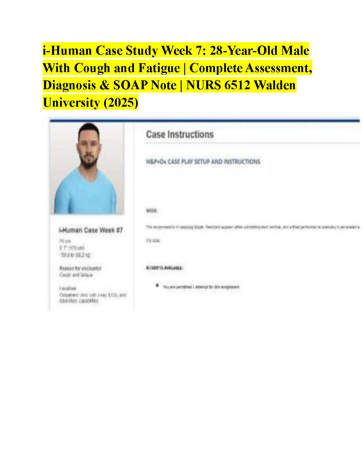 Unlock success in your NURS 6512 course at Walden University with this comprehensive guide for the i-Human Week 7 case study. This resource, updated for the 2025/2026 academic year, provides a complete assessment, accurate diagnosis, and a detailed SOAP note for the 28-year-old male patient presenting with cough and fatigue. Master the material, enhance your clinical skills, and pass your exams on the first attempt, avoiding costly resits.