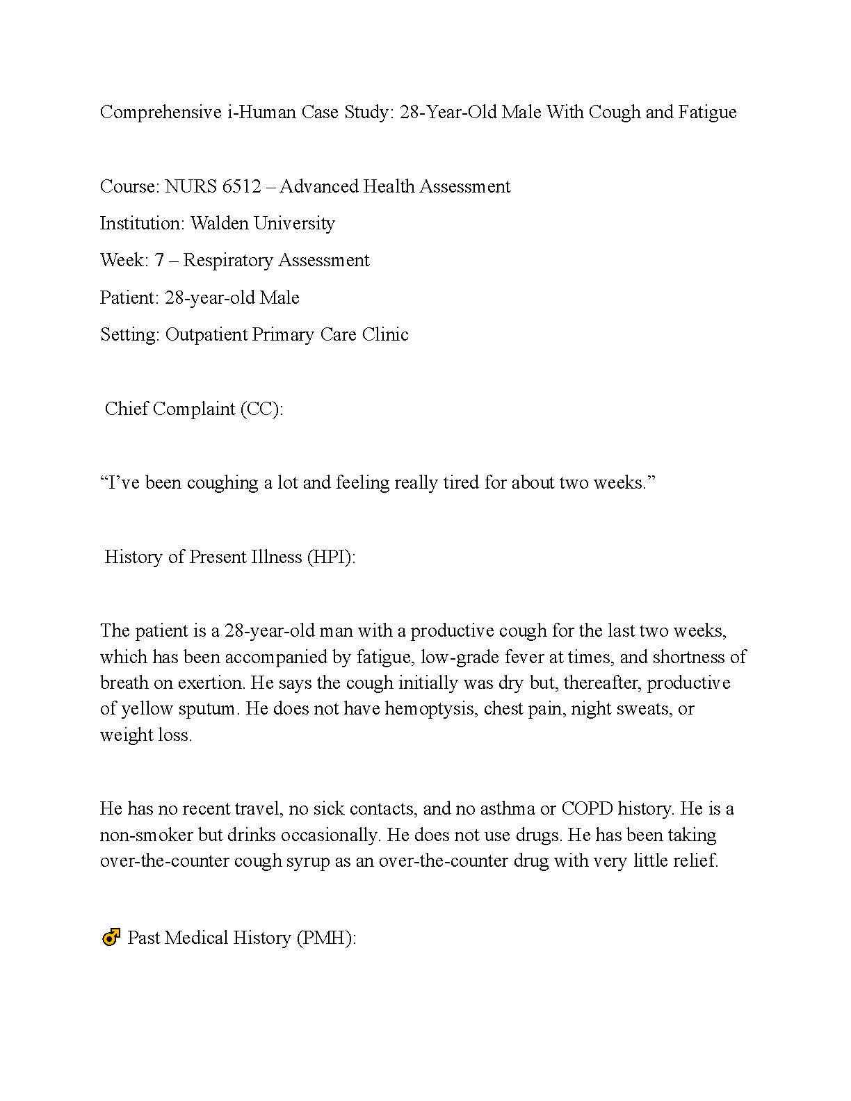 NURS 6512 i-Human Week 7 Case Study: 28-Year-Old Male (Cough & Fatigue) - Complete Assessment & SOAP Note | 2025/2026 First Attempt Pass Guide