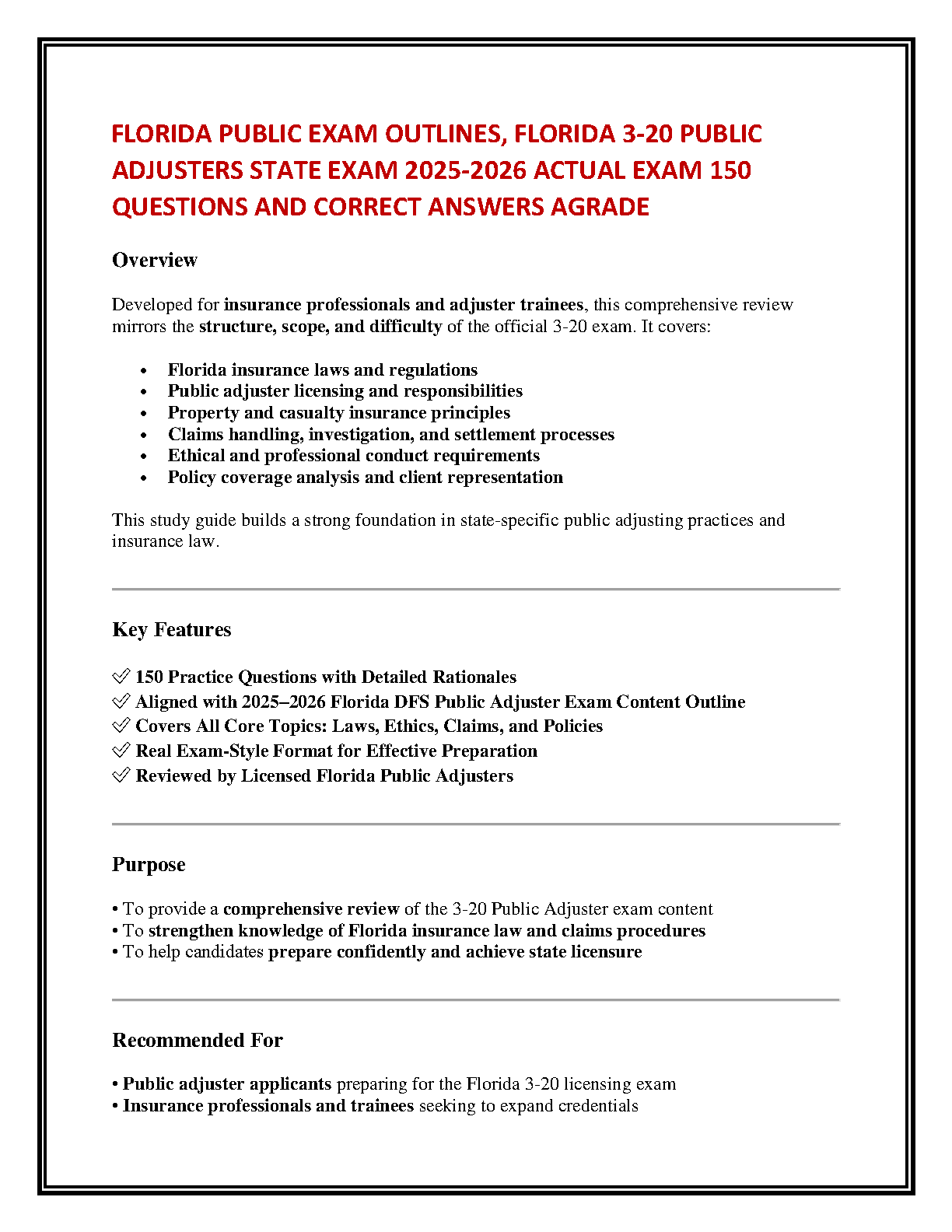 Ace your Florida 3-20 Public Adjuster licensing exam on the first try with our comprehensive 2025-2026 test bank! This up-to-date study guide features 150 real exam-style questions, complete with detailed, verified answers and rationales. Developed by licensed Florida Public Adjusters, this resource is perfectly aligned with the latest Florida DFS exam content outline. It covers all essential topics, including state insurance laws, adjuster responsibilities, claims handling, and professional ethics. Stop worrying about resits and start preparing confidently to earn your state licensure today!