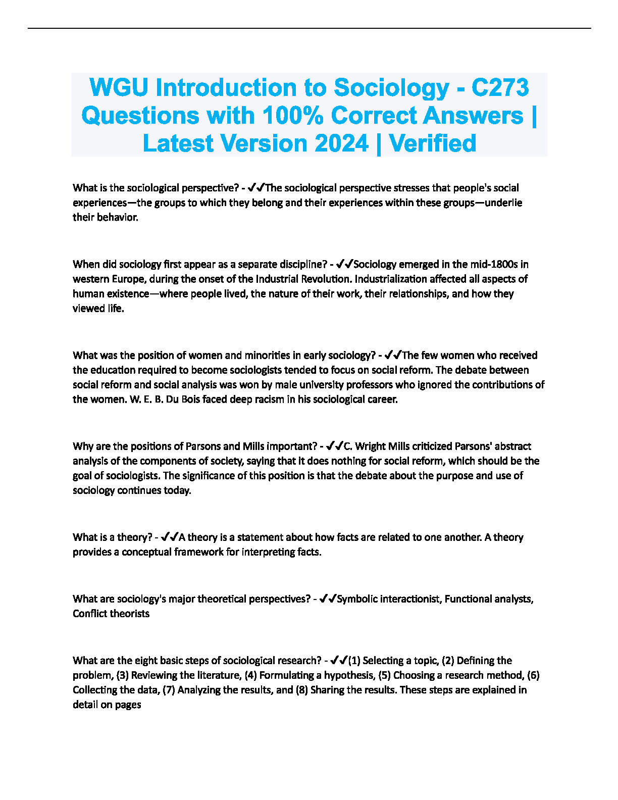 Ace your WGU C273 Introduction to Sociology course with this comprehensive and verified test bank for 2024. This essential study resource provides a complete set of questions with 100% correct, expert-verified answers, covering all the crucial topics you need to master. Dive deep into key concepts such as the sociological perspective, the historical emergence of the discipline, major theoretical frameworks (Symbolic Interactionism, Functionalism, Conflict Theory), and the fundamental steps of sociological research. This test bank is your ultimate tool for effective exam preparation, helping you pass C273 with confidence.