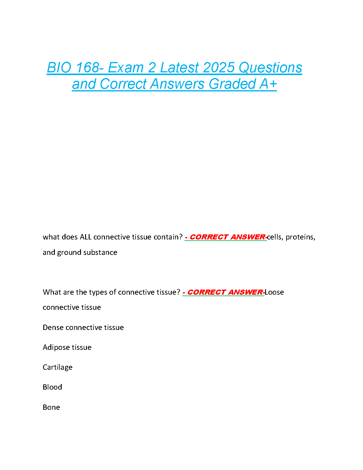 Excel in your BIO 168 course with our comprehensive Test Bank for Exam 2, fully updated for the 2025/2026 academic year. This essential study guide features a complete collection of the latest exam questions, each paired with a verified, A+ graded answer. Dive deep into key topics like histology and connective tissues to ensure you have the knowledge to ace your test. Designed to help you study smarter, not harder, this resource is your key to mastering the material and passing your exam on the first attempt, avoiding costly resits. Download now for instant access and secure your top grade!