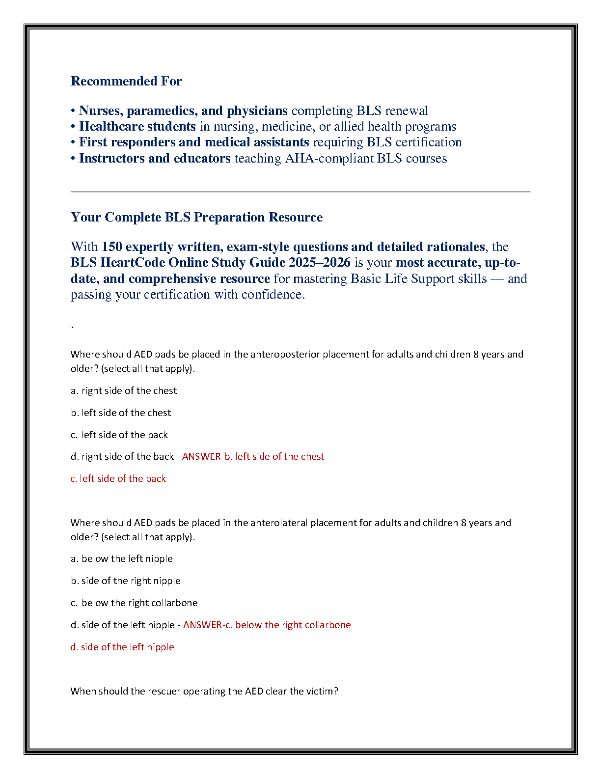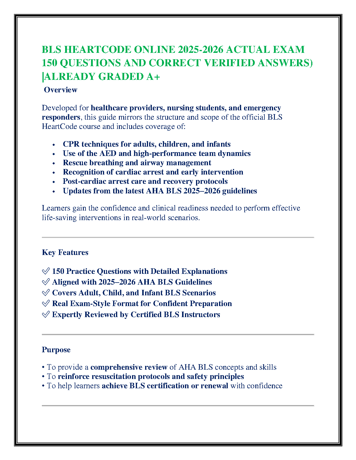 Master the BLS HeartCode Online certification with our comprehensive test bank for the 2025-2026 academic year. This essential study guide, developed by the American Heart Association (AHA), is tailored for healthcare providers, nursing students, and emergency responders aiming to pass their exam on the first attempt. Featuring 150 actual exam questions with verified, A+ graded answers and detailed explanations, this resource ensures you are fully prepared. Key topics include: Latest CPR techniques for adults, children, and infants; Proper use of AED and high-performance team dynamics; Rescue breathing, airway management, and early intervention for cardiac arrest; Post-cardiac arrest care and recovery protocols. Aligned with the most current 2025-2026 AHA BLS guidelines, our test bank provides a real-exam-style format to build your confidence and clinical readiness. Achieve your BLS certification or renewal efficiently and avoid resits with this expertly reviewed guide.
