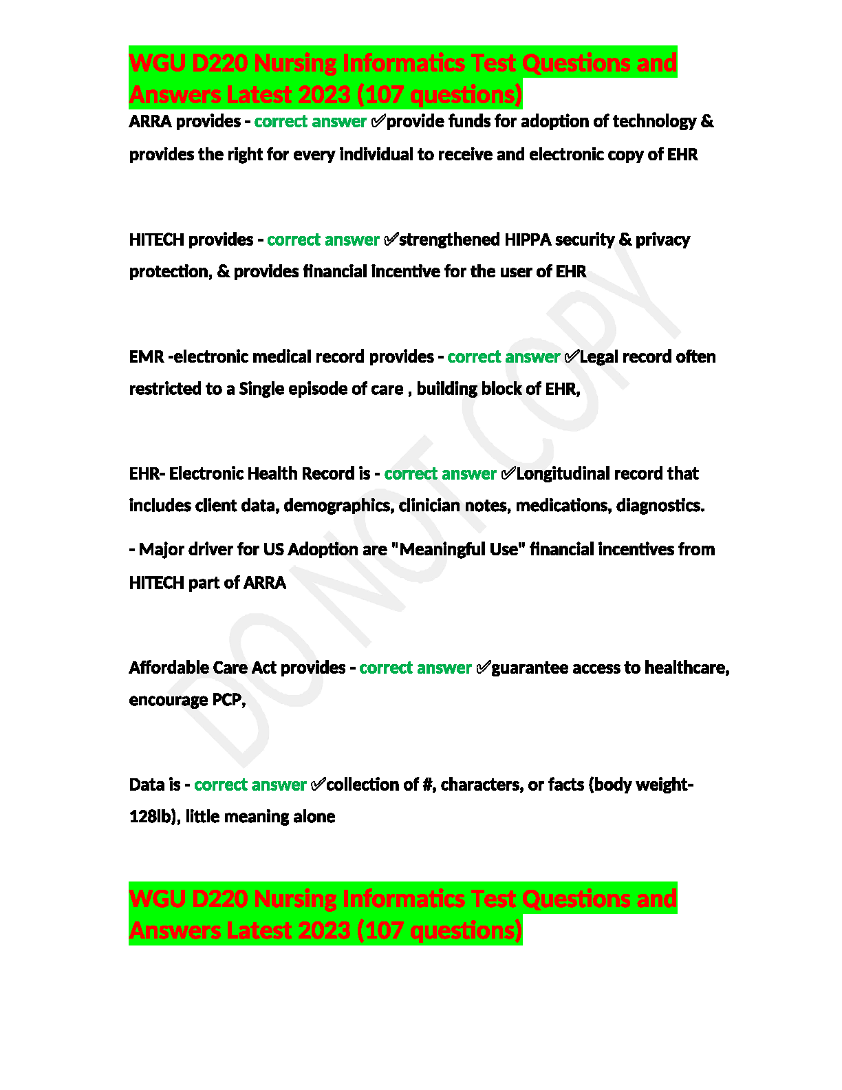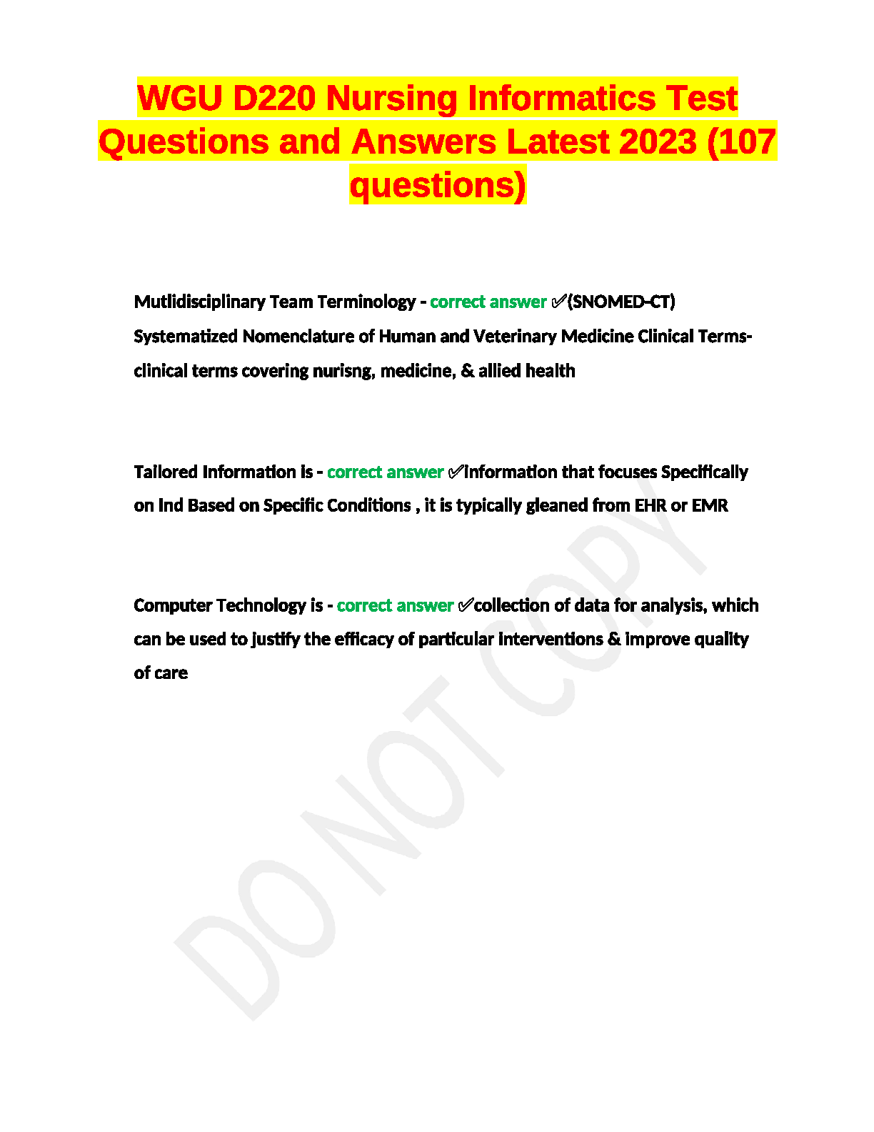 WGU D220 Nursing Informatics Test Bank (Latest 2023 Edition) | 107 Comprehensive Questions with Verified Answers