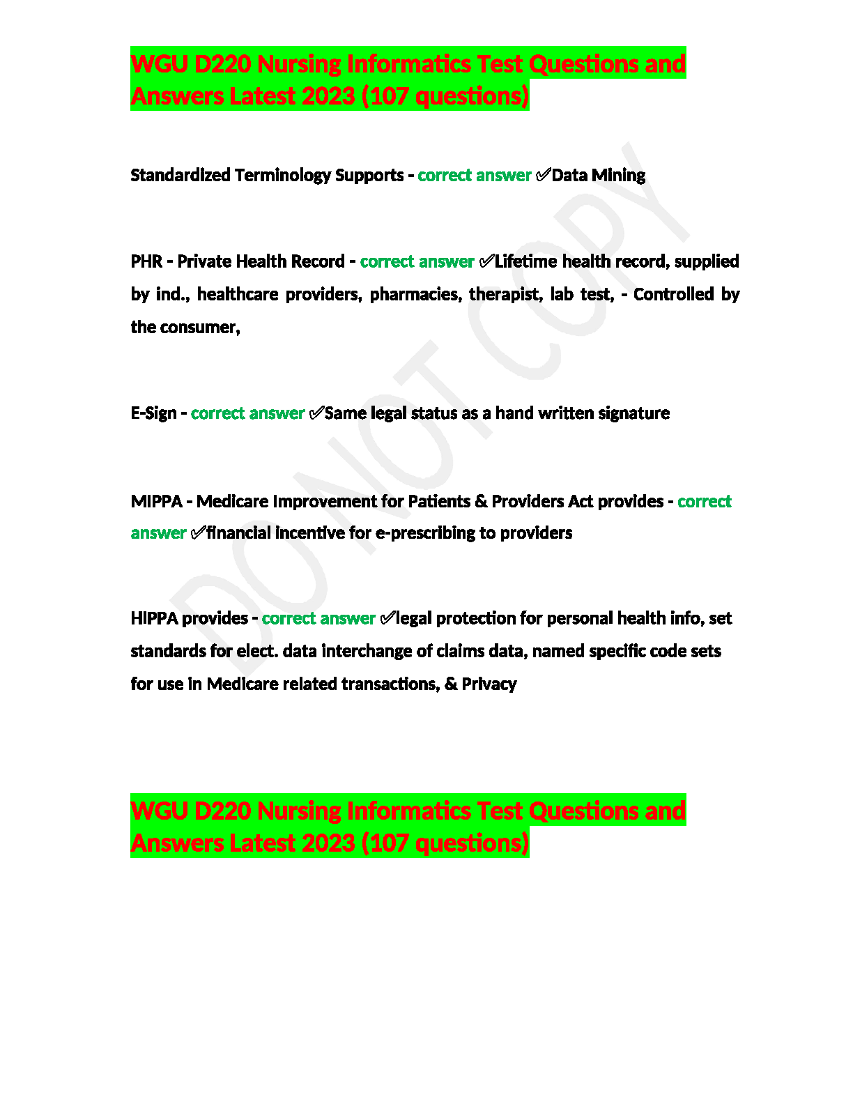 Get ready to ace your WGU D220 Nursing Informatics exam with our comprehensive test bank! This latest 2023 edition features 107 meticulously crafted questions, each paired with a verified correct answer. This study guide covers all essential topics, including multidisciplinary team terminology like SNOMED-CT, the use of tailored information from EHR/EMR, and the role of computer technology in improving patient care. Designed to help you understand complex concepts and test your knowledge, this resource is your key to passing the exam on your first attempt and avoiding resits. Download now for instant access to the ultimate study tool for WGU D220.