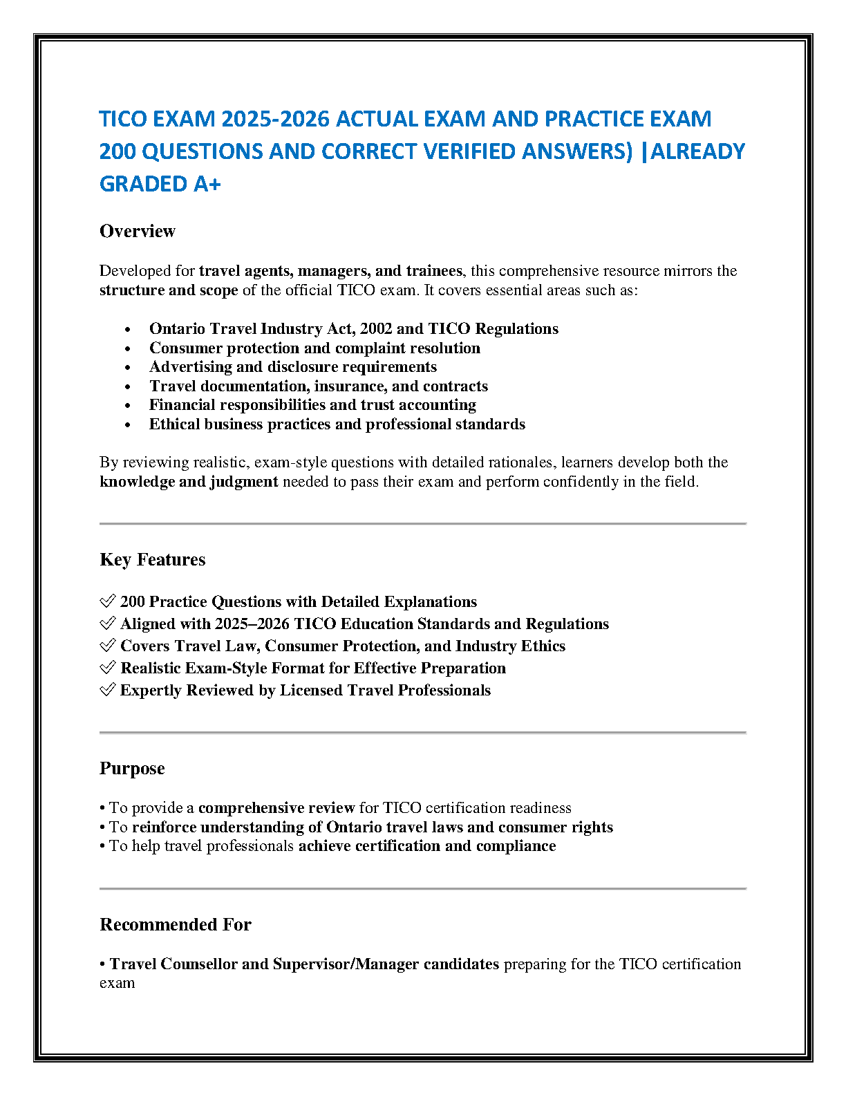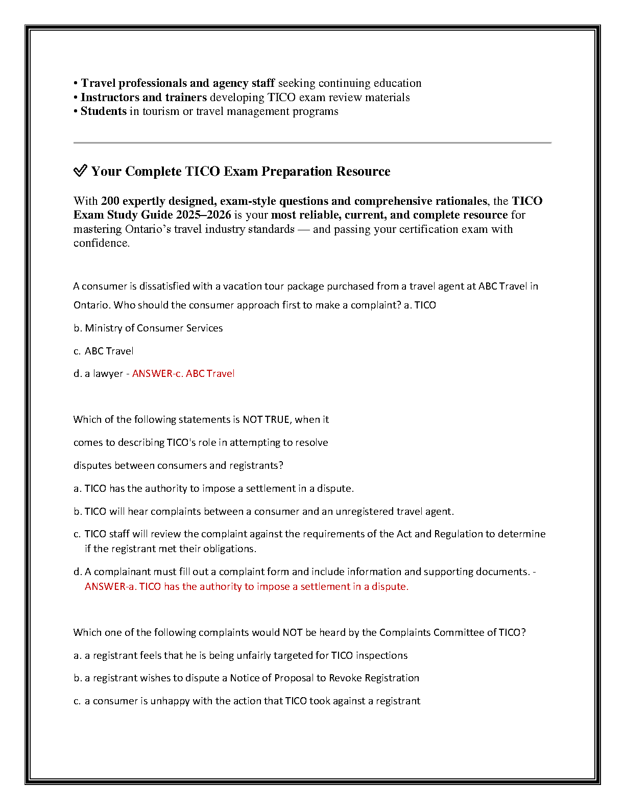 Prepare to ace your Travel Industry Council of Ontario (TICO) certification with our comprehensive 2025-2026 exam prep guide. This essential resource features 200 realistic, exam-style questions complete with correct, verified answers and detailed explanations. Designed for aspiring travel counsellors, supervisors, and managers, this guide covers all critical topics, including the Ontario Travel Industry Act 2002, TICO Regulations, consumer protection, and ethical business practices. Our expertly reviewed content is fully aligned with the latest 2025-2026 TICO Education Standards, providing you with the knowledge and confidence to pass your exam on the first attempt and avoid resits. Get instant access to the ultimate study tool and fast-track your career in the travel industry.