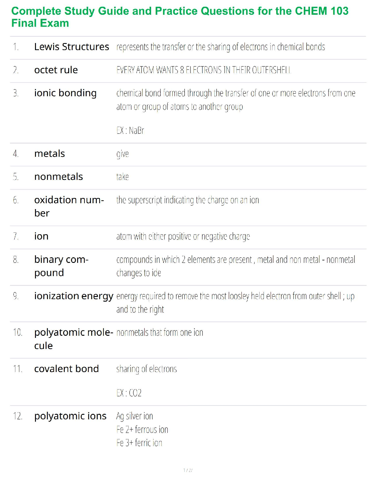 Get ready to ace your CHEM 103 final exam with our brand-new, comprehensive study guide for the 2025/2026 academic year. This resource is meticulously designed to help you pass on your first attempt, avoiding costly resits. It covers all essential topics, from foundational concepts like Lewis Structures, the octet rule, and chemical bonding to oxidation numbers and polyatomic ions. Packed with clear definitions, examples, and practice questions, this guide is your ultimate tool for mastering introductory chemistry and achieving top grades.