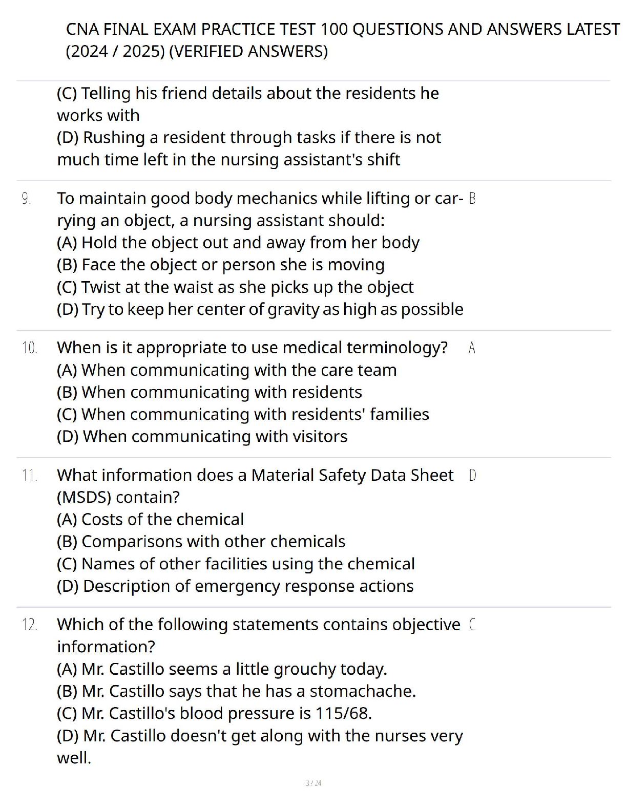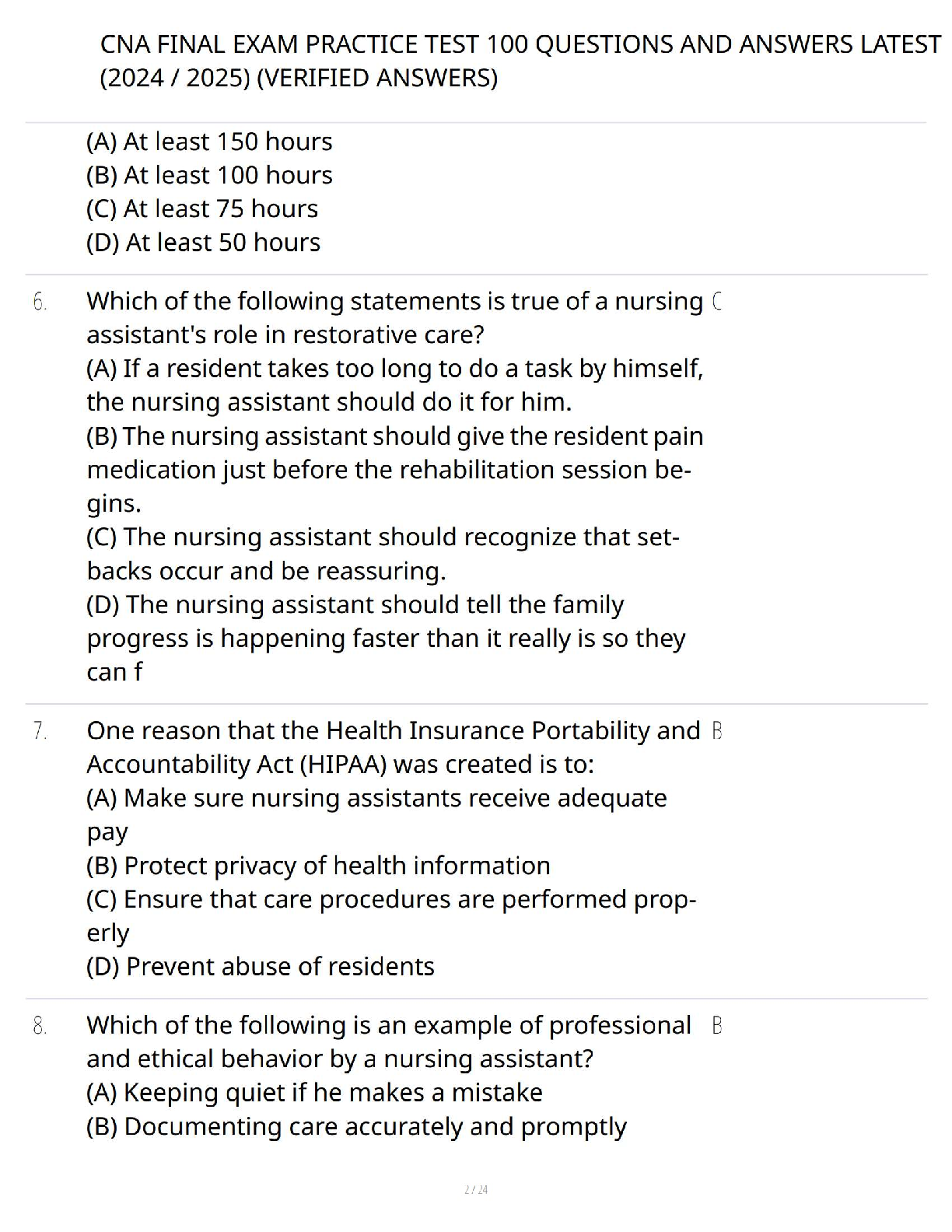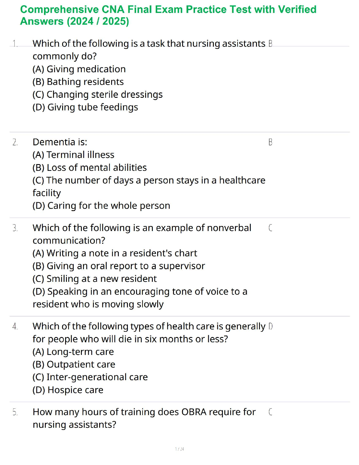 CNA Final Exam Test Bank 2024/2025: Comprehensive Practice Questions with Verified Answers