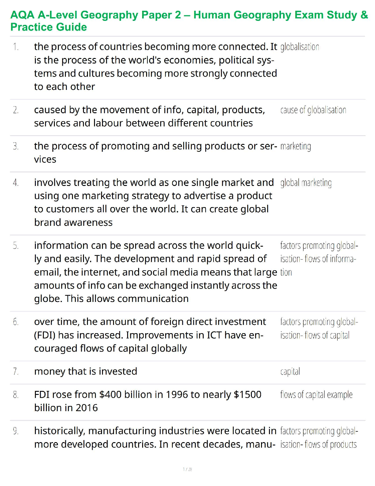 Ace your AQA A-Level Geography Paper 2 exams with our comprehensive Human Geography Study & Practice Guide, fully updated for the 2025/2026 academic year. This guide provides a detailed breakdown of all essential topics, including globalization, flows of capital, and global marketing, designed to help you understand complex concepts with ease. Master the syllabus and secure top grades with this ultimate resource, crafted to help you pass on your first attempt and avoid resits. Perfect for revision and exam preparation.