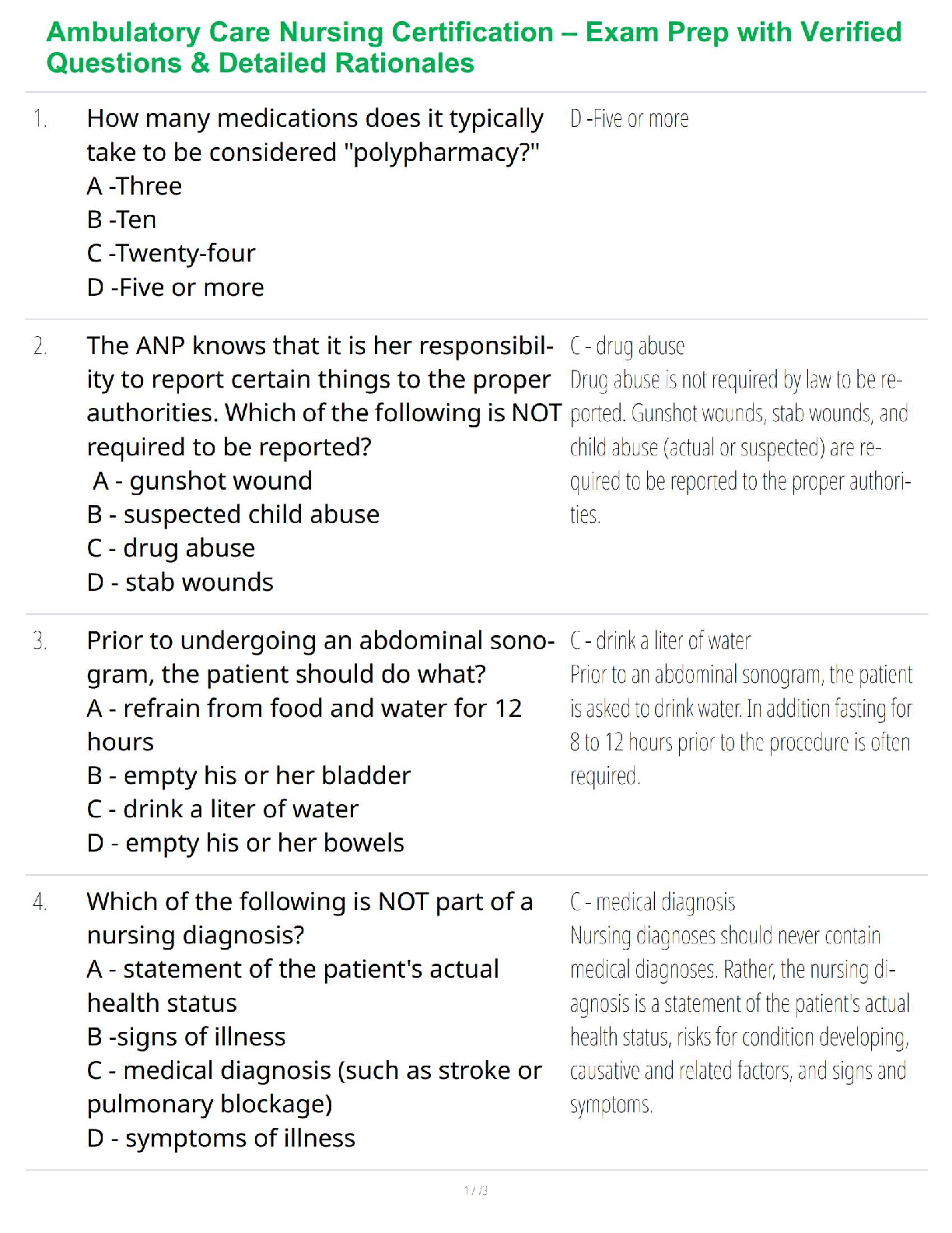 Prepare to ace your Ambulatory Care Nursing Certification exam with our comprehensive test bank for the 6th Edition by Candia Laughlin and Sheila Haas. This updated 2025/2026 resource is your ultimate study guide, featuring a vast collection of verified exam questions complete with detailed rationales. Each question is designed to mirror the actual certification test, covering all essential topics to ensure you're fully prepared. Master key concepts, understand the reasoning behind correct answers, and build the confidence you need to pass on your very first attempt.