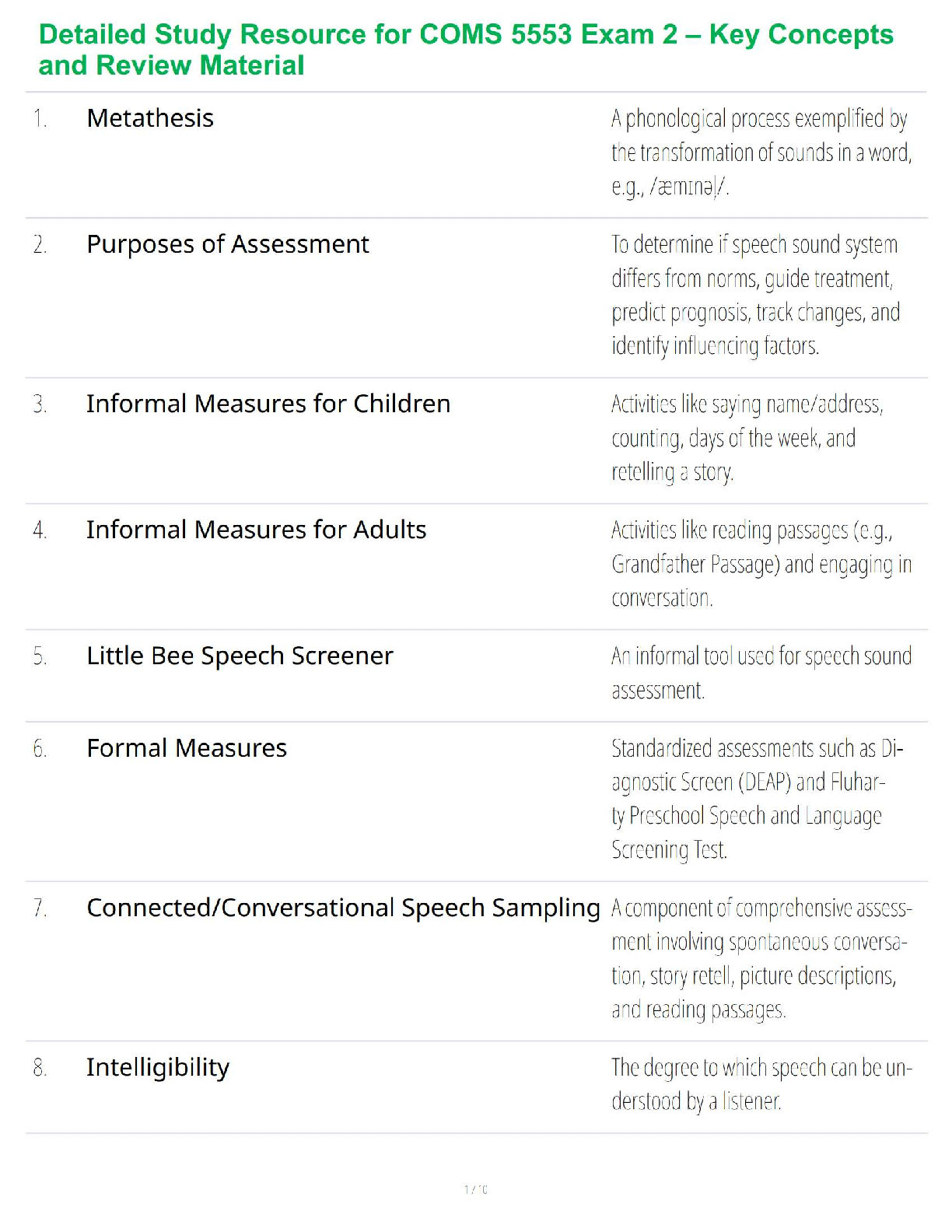 Excel in your COMS 5553 Exam 2 with our newly released study guide, tailored for the 2025/2026 academic year. This comprehensive resource is designed to help you pass on your first attempt, covering all critical topics in detail. Dive into key concepts such as Metathesis, the core purposes of assessment, informal vs. formal measures for children and adults, speech sampling techniques, and intelligibility. This essential review material provides the clarity and focus you need to master the subject and ace your exam.