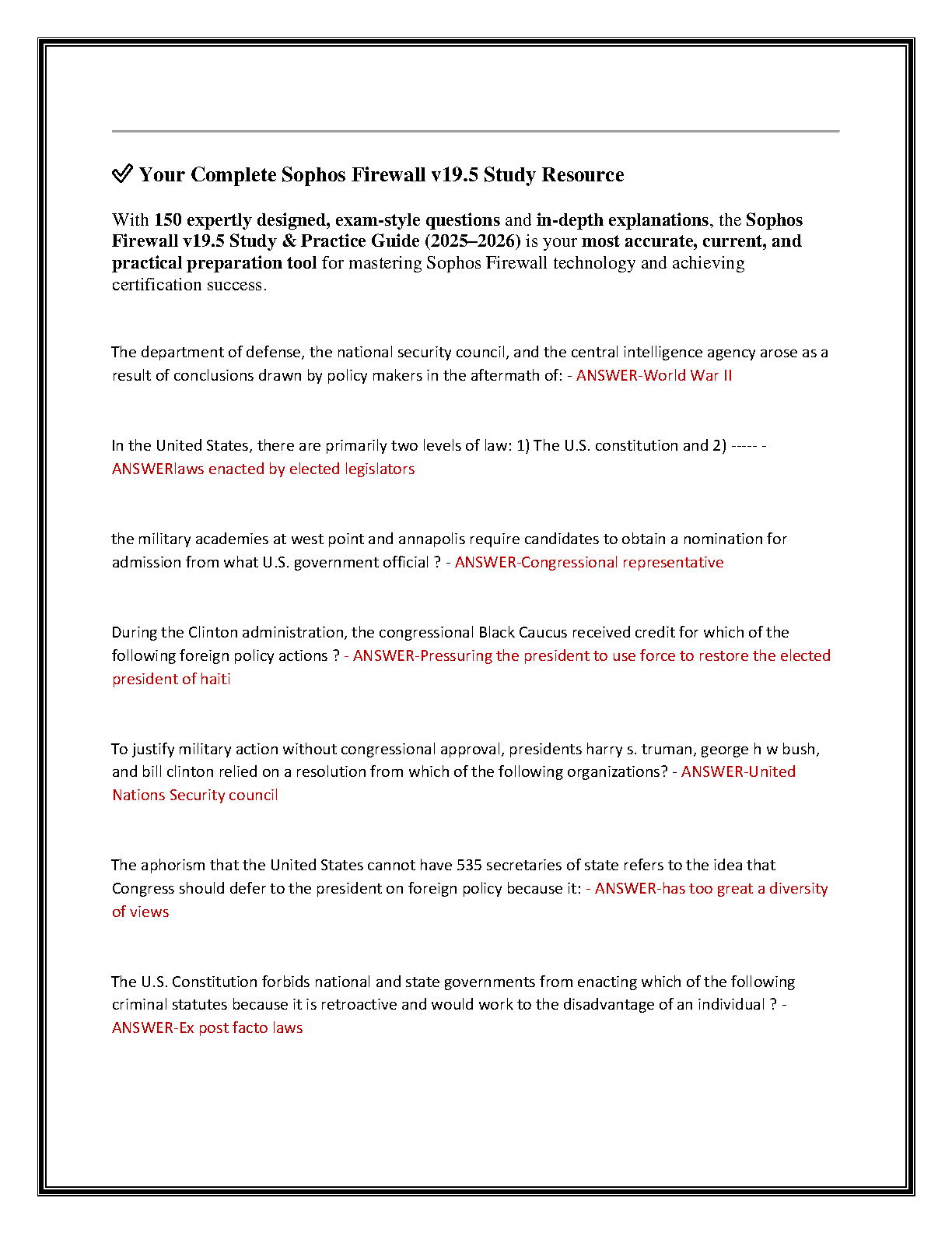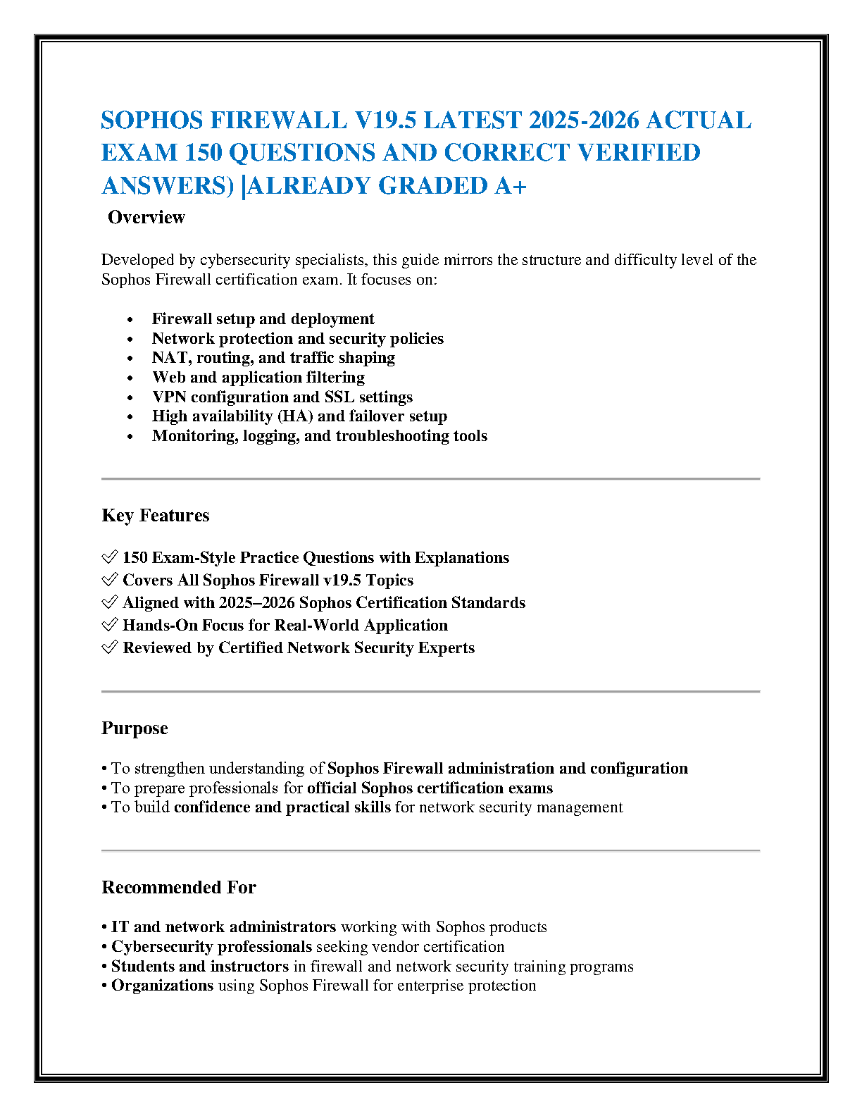 Master the Sophos Firewall v19.5 certification exam with our comprehensive test bank, updated for the 2025-2026 academic year. This guide features 150 actual exam-style questions, complete with correct, verified answers and detailed explanations. Developed and reviewed by certified network security experts, this resource covers all essential topics, including firewall deployment, network security policies, NAT, routing, VPN configuration, and high availability. It's the ultimate tool for IT administrators, cybersecurity professionals, and students aiming to pass their Sophos certification on the first attempt and gain practical, real-world skills.