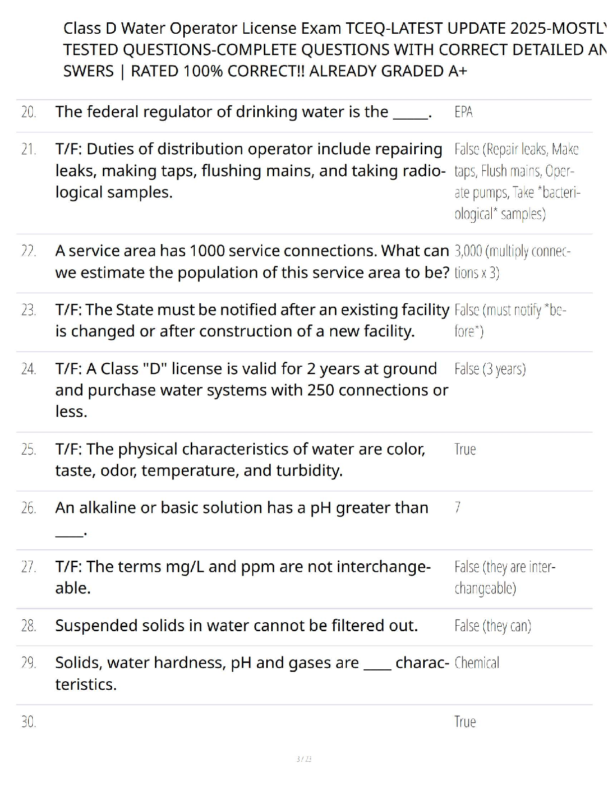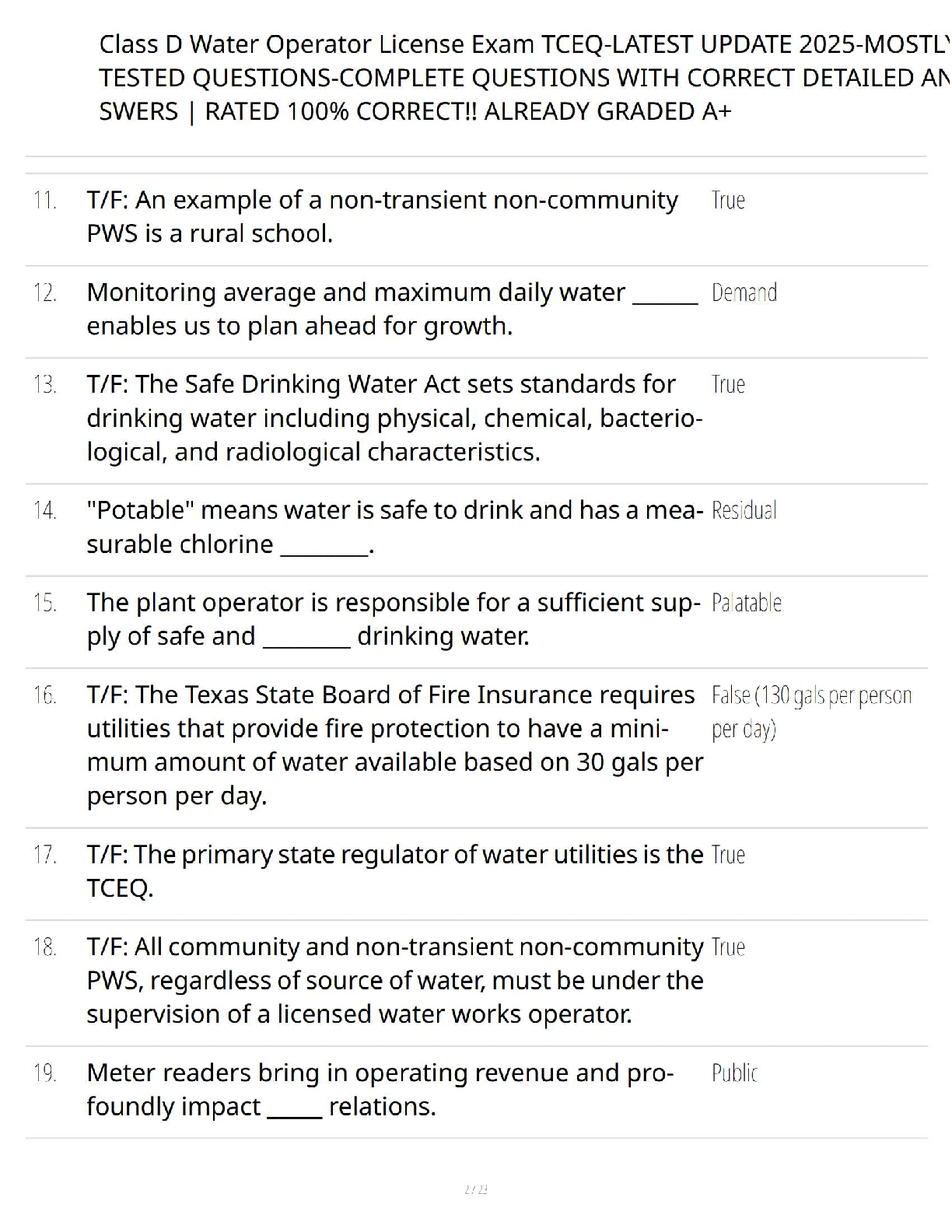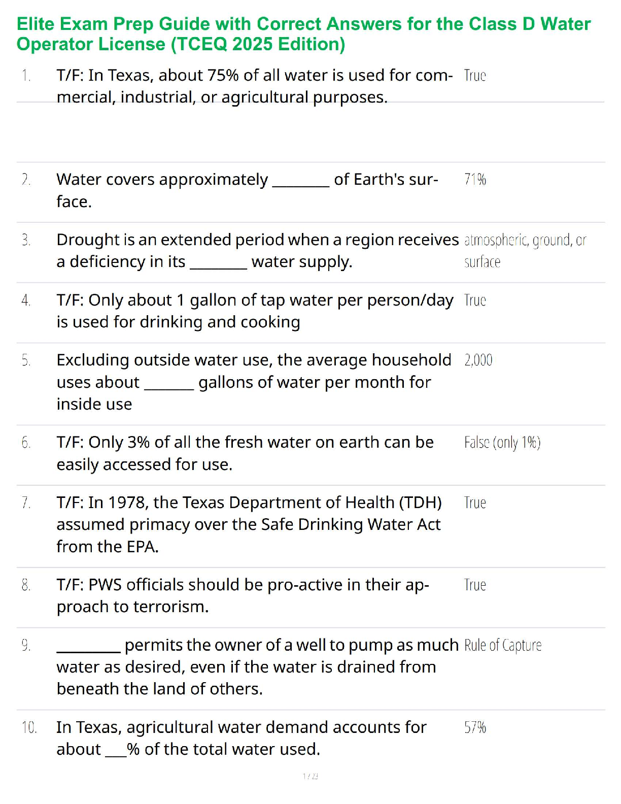 Prepare to ace your Class D Water Operator License exam with our meticulously compiled 2025 TCEQ Test Bank. This premium study resource, based on the Elite Exam Prep guide, provides a complete set of exam-style questions paired with verified, accurate answers. Covering all essential topics from water usage statistics to the Safe Drinking Water Act, this guide is your key to mastering the material. Streamline your study process and walk into your TCEQ exam with confidence. Get the edge you need to pass on your first attempt!