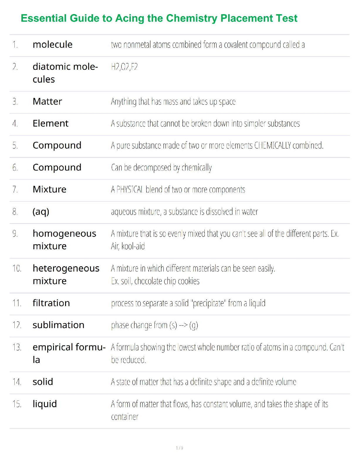 Prepare to excel in your upcoming Chemistry Placement Test with our comprehensive study guide, fully updated for the 2025/2026 academic year. This guide provides clear, concise definitions and explanations of all fundamental chemistry concepts, from the basics of matter and elements to the differences between mixtures and compounds. Master key topics like empirical formulas, states of matter, and separation techniques to build a strong foundation. This essential resource is specifically designed to help you ace your exam on the first attempt, ensuring you place into the right chemistry course without the need for resits. Get the confidence you need to succeed!