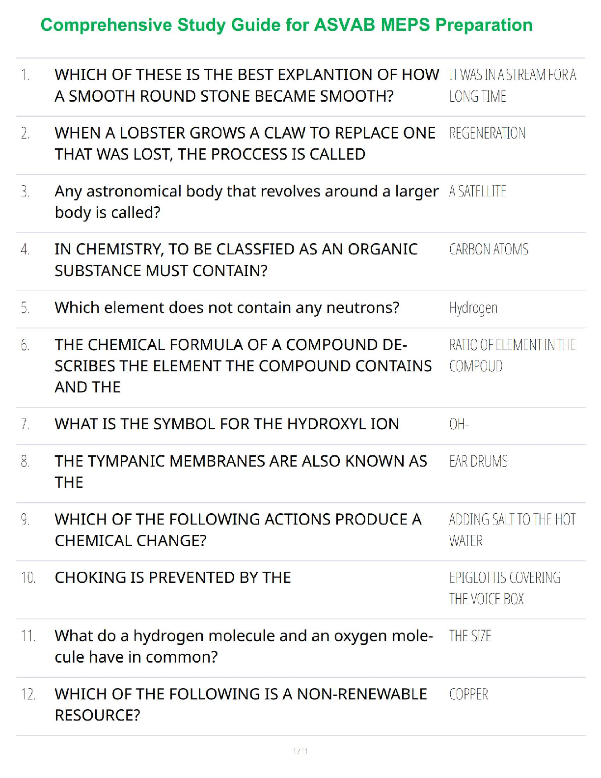 Unlock your potential and ace the Armed Services Vocational Aptitude Battery (ASVAB) with our premier Test Bank. This comprehensive study guide is packed with practice questions and 100% correct, verified answers, covering all essential subjects you'll face at MEPS. From General Science to Chemistry and Biology, our resource is meticulously crafted to ensure you understand the core concepts. Prepare effectively, boost your confidence, and pass the ASVAB on your first attempt, paving the way for your desired military career. Say goodbye to exam anxiety and avoid costly resits with this ultimate preparation tool.