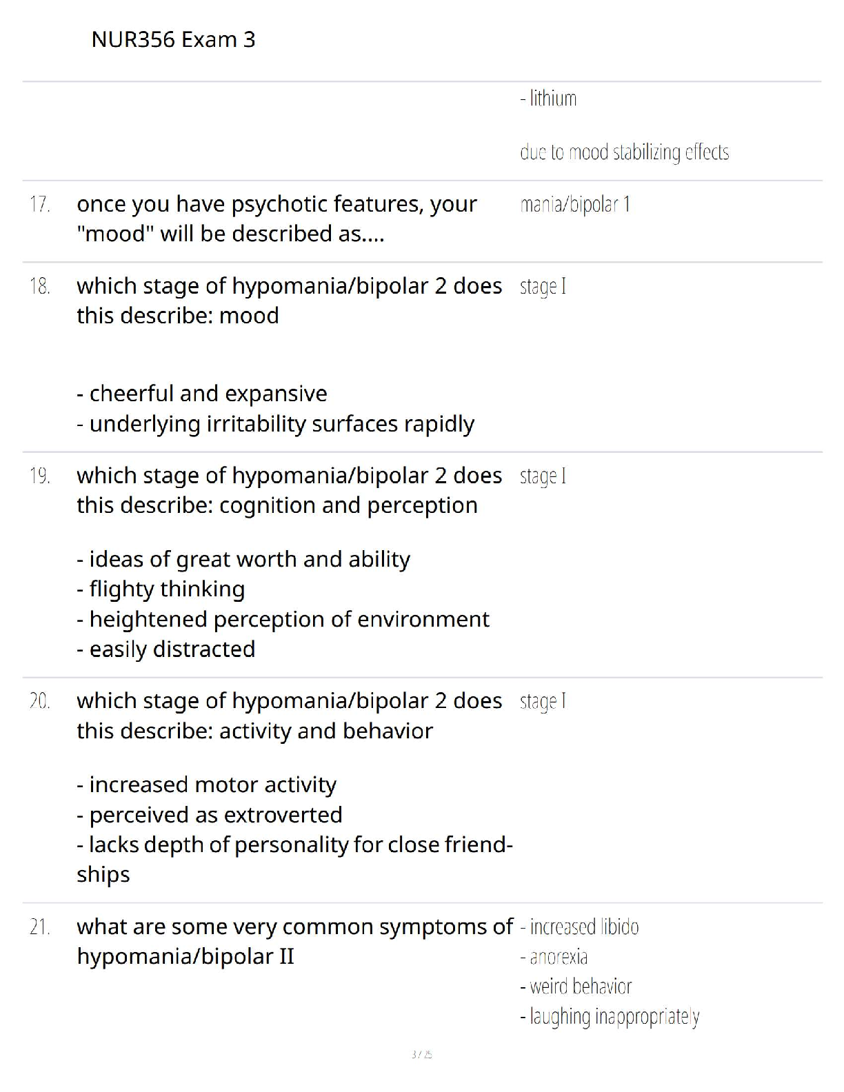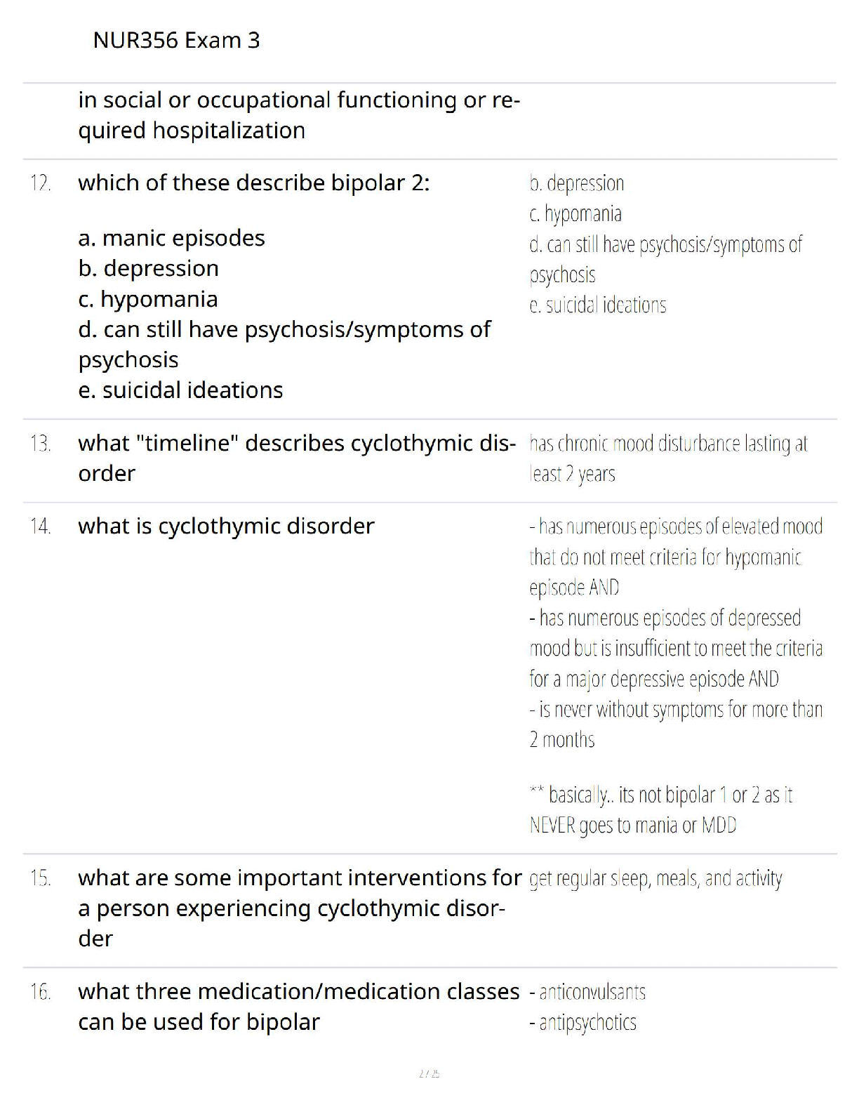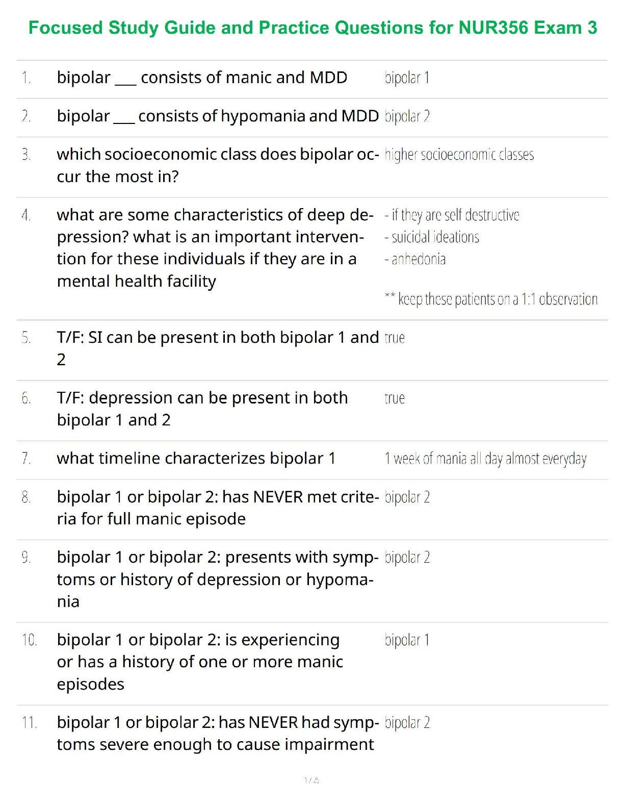Get ready to ace your NUR356 Exam 3 with this comprehensive study guide, fully updated for the 2025/2026 academic year. This resource provides focused practice questions and detailed answers covering essential mental health nursing topics. Dive deep into the nuances of Bipolar 1 and Bipolar 2, understand key characteristics of Major Depressive Disorder (MDD), and learn critical interventions for patients with suicidal ideations. This Q&A formatted guide is expertly designed to clarify complex concepts and ensure you pass your exam on the first attempt, avoiding costly resits.