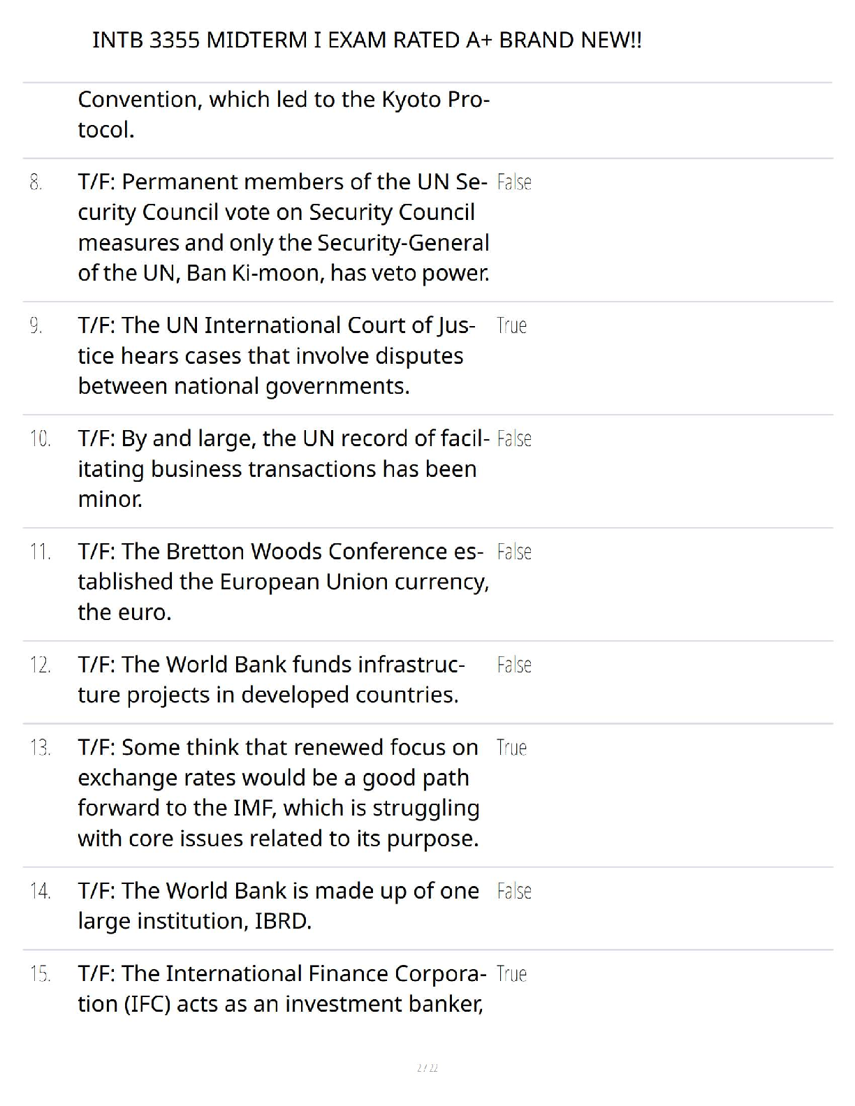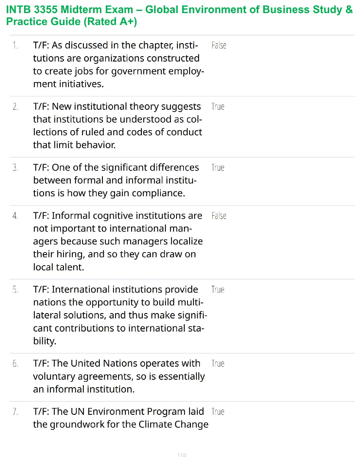 Unlock academic success in your INTB 3355 course with our premium Test Bank for 'Global Business, 5th Edition' by Mike W. Peng and Klaus E. Meyer. This A+ rated study guide is meticulously designed to cover all essential topics for your midterm exam, providing a rich collection of True/False questions and detailed answers. Dive deep into the complexities of the global business environment, from institutional theory to international relations. Prepare effectively, boost your confidence, and secure a top grade. This resource is your key to mastering the material and passing your exam on the first attempt.