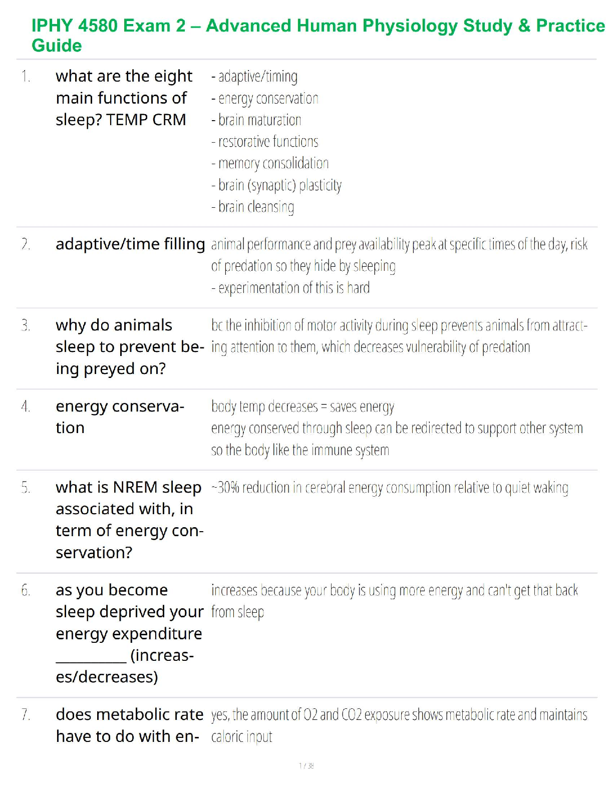 Struggling with Advanced Human Physiology? Get the ultimate advantage for IPHY 4580 Exam 2 with our brand-new, comprehensive study and practice guide for the 2025/2026 academic year. This guide breaks down complex topics into an easy-to-understand question and answer format, covering crucial areas like the eight main functions of sleep, energy conservation, brain plasticity, memory consolidation, and the effects of sleep deprivation. Designed to help you master the material and pass your exam on the very first try, this is the essential resource to avoid resits and achieve top grades. Download now and start studying smarter!
