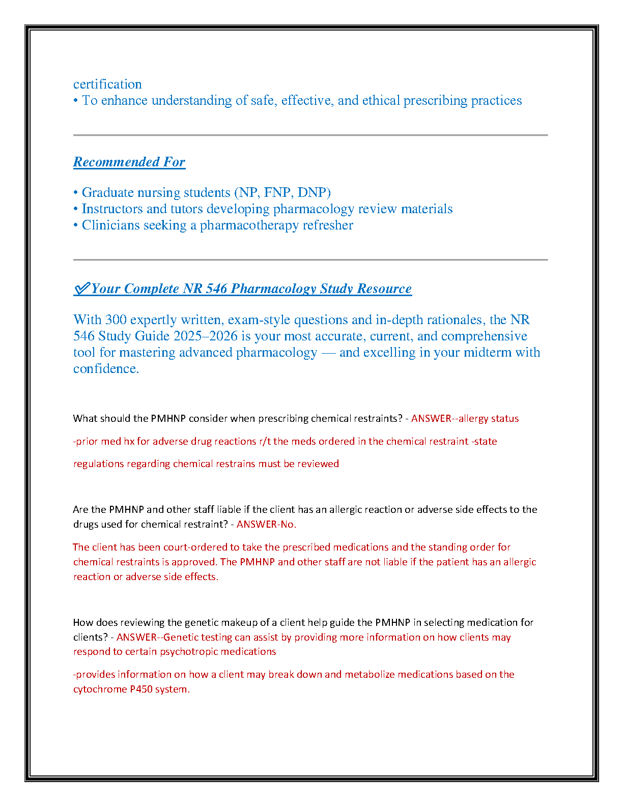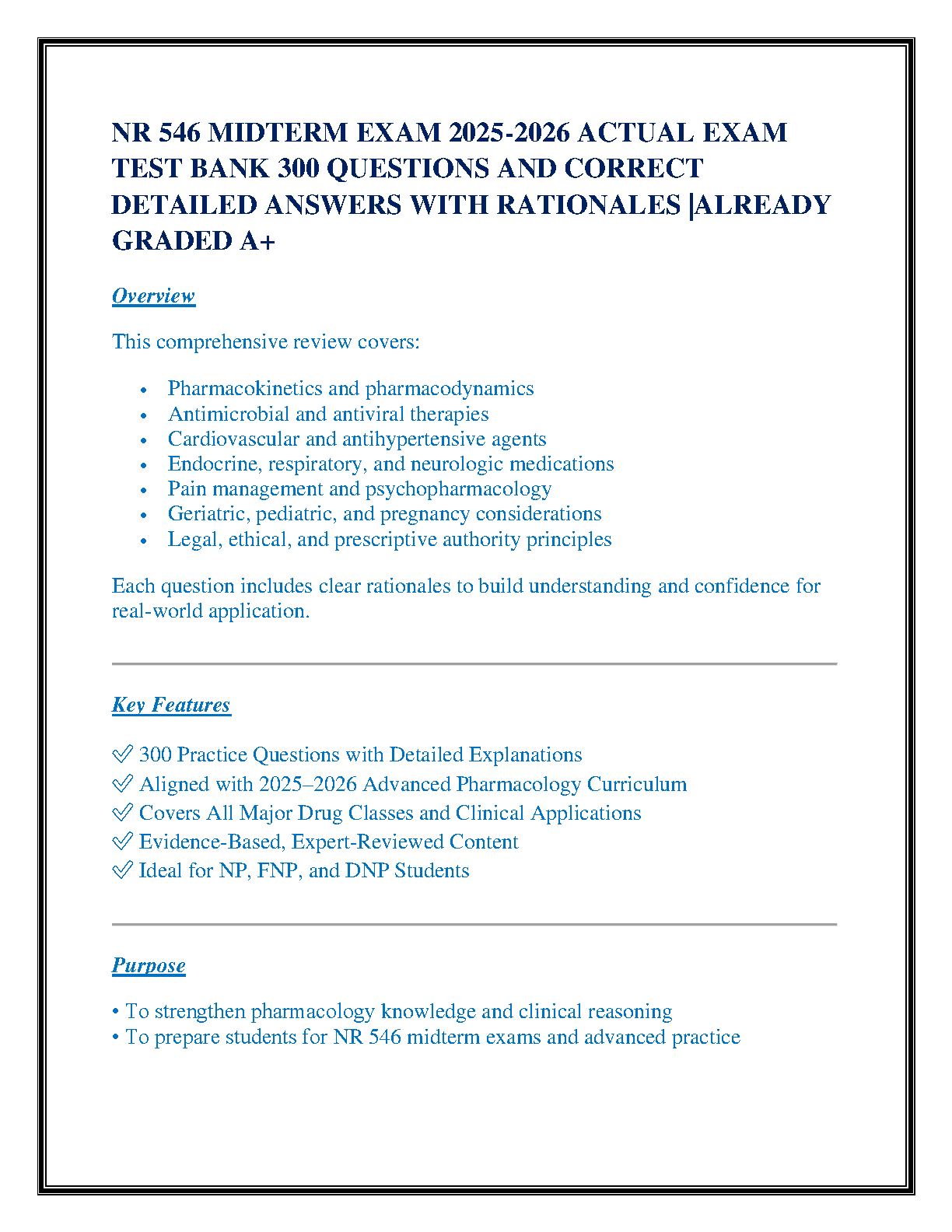 Ace your NR 546 Advanced Pharmacology Midterm Exam with our latest 2025-2026 test bank. This comprehensive study guide features 300 expertly-crafted questions complete with detailed answers and in-depth rationales, ensuring you grasp complex concepts and build confidence for exam day. Master essential topics including pharmacokinetics, pharmacodynamics, antimicrobial therapies, cardiovascular agents, psychopharmacology, and special population considerations. Perfectly designed for NP, FNP, and DNP students, this A-grade resource is your key to strengthening clinical reasoning and passing your midterm on the first attempt.