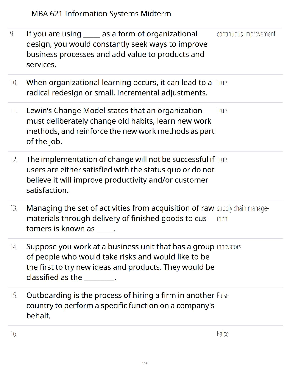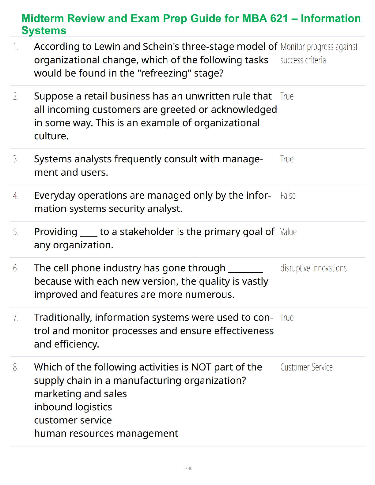 Ace your MBA 621 Information Systems midterm with this complete test bank and exam prep guide. This resource provides a comprehensive collection of verified questions and detailed answers, covering all essential topics from the course curriculum. Master key concepts such as organizational change models, systems analysis, IT security, and supply chain management. This study guide is meticulously designed to help you understand the material, practice with real exam-style questions, and achieve a top grade on your first attempt. Download now and start studying smarter, not harder.