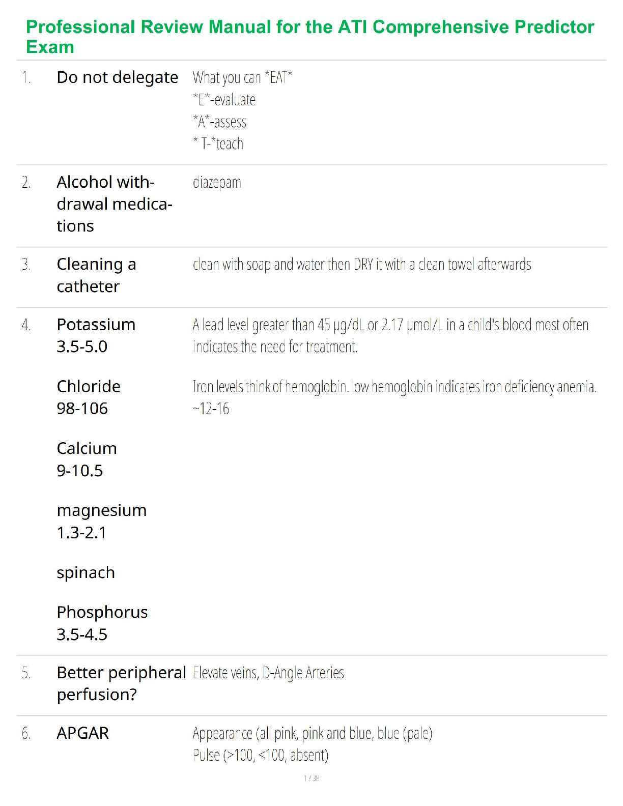 Unlock your full potential and conquer the ATI Comprehensive Predictor Exam with our newly updated 2025/2026 Professional Review Manual. This all-in-one study guide distills complex nursing concepts into easy-to-remember formats, covering critical areas such as delegation principles (EAT mnemonic), pharmacology for conditions like alcohol withdrawal, fundamental procedures, essential lab values, and more. Designed specifically to help you pass on your very first try, this manual is the perfect resource to build confidence, streamline your study process, and secure the score you need. Avoid the stress of resits and step into your exam prepared for success!