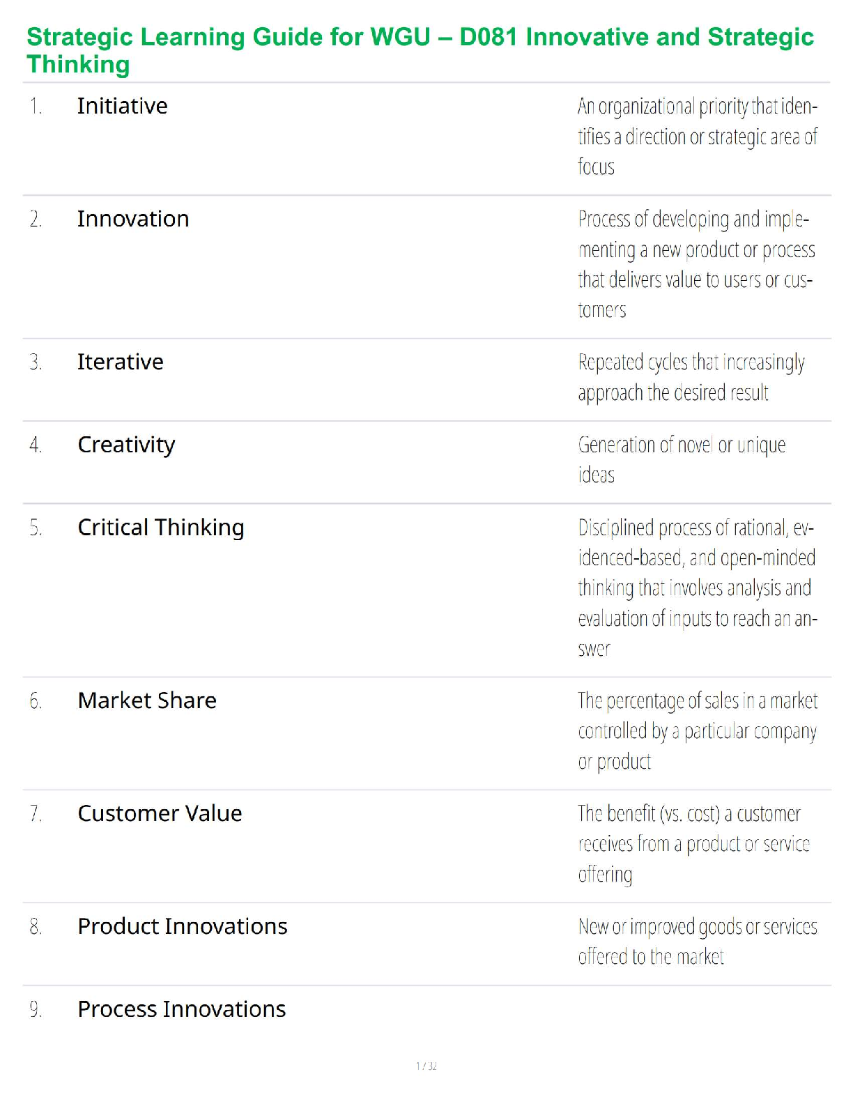 Unlock success in your WGU D081 course with this comprehensive Strategic Learning Guide for the 2025/2026 academic year. This expertly crafted resource breaks down all essential concepts, including 'Innovation,' 'Critical Thinking,' and 'Market Share,' into clear, easy-to-understand definitions. Designed to streamline your learning process, this guide is your key to mastering the material and passing your exam confidently on the first try, eliminating the need for costly resits.