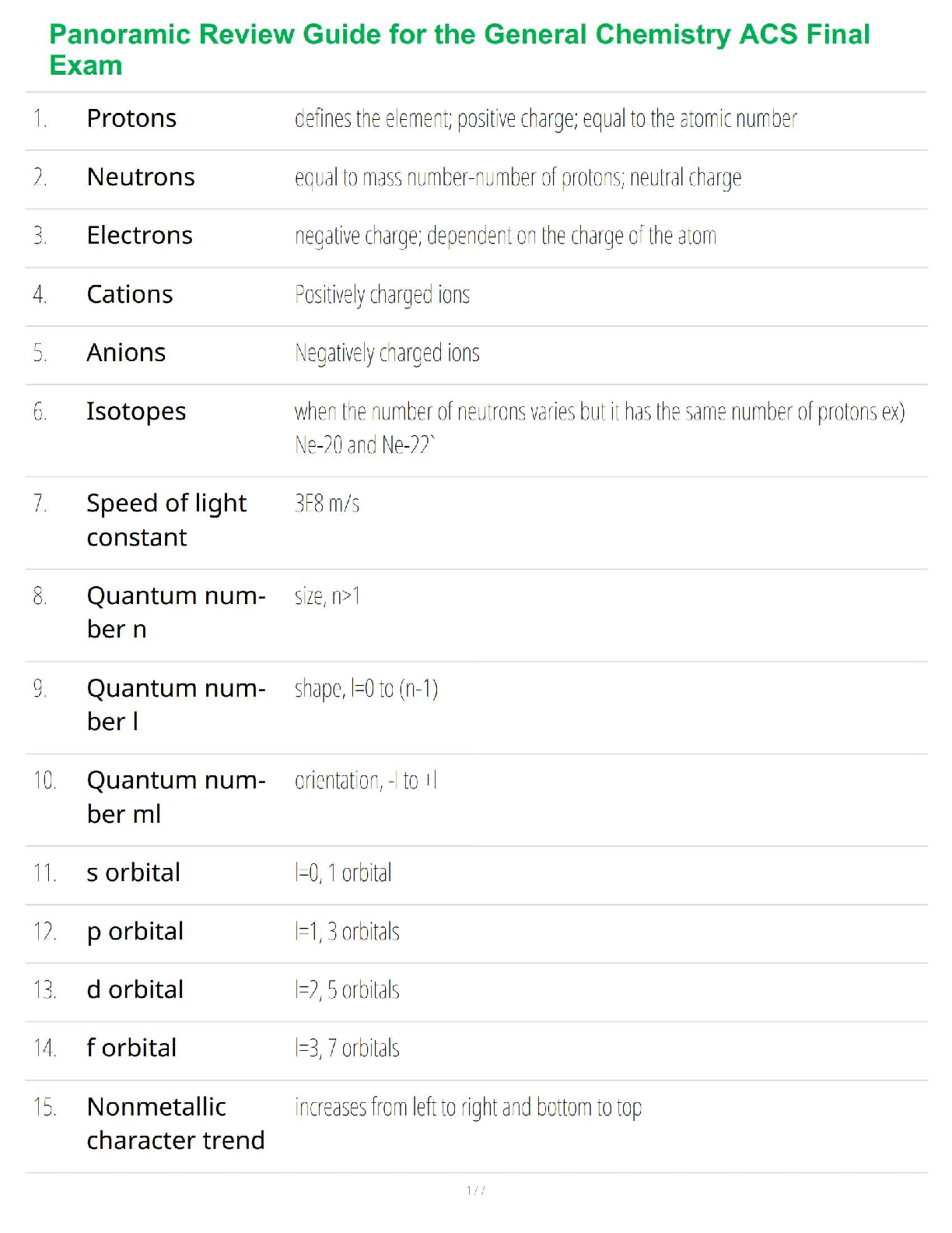 Ace your General Chemistry ACS Final Exam with ease! This comprehensive, panoramic review guide for the 2025/2026 academic year is expertly crafted to be your ultimate tool for success. Dive deep into all essential topics, from the fundamentals of atomic structure—including protons, neutrons, and electrons—to complex concepts like quantum numbers, orbitals, isotopes, and periodic trends. This guide simplifies difficult material into easy-to-understand definitions and key points, designed specifically to help you master the material and pass on your very first attempt, eliminating the need for resits.