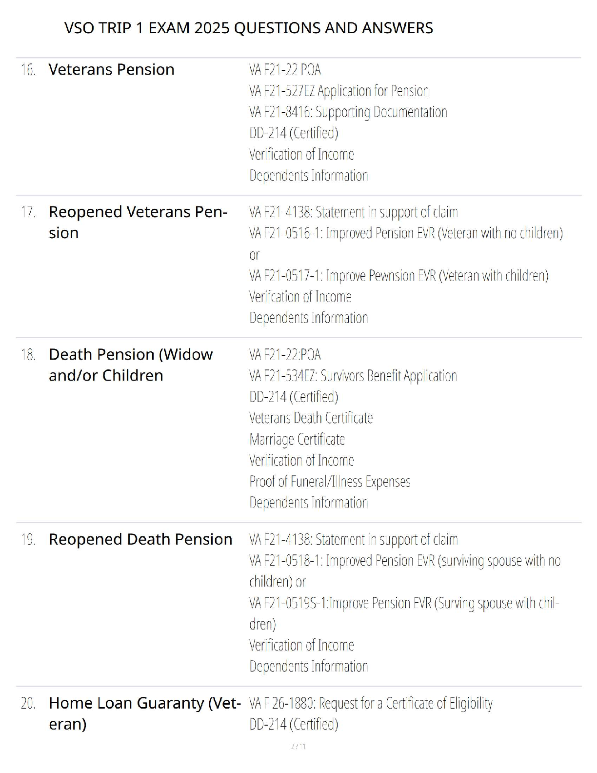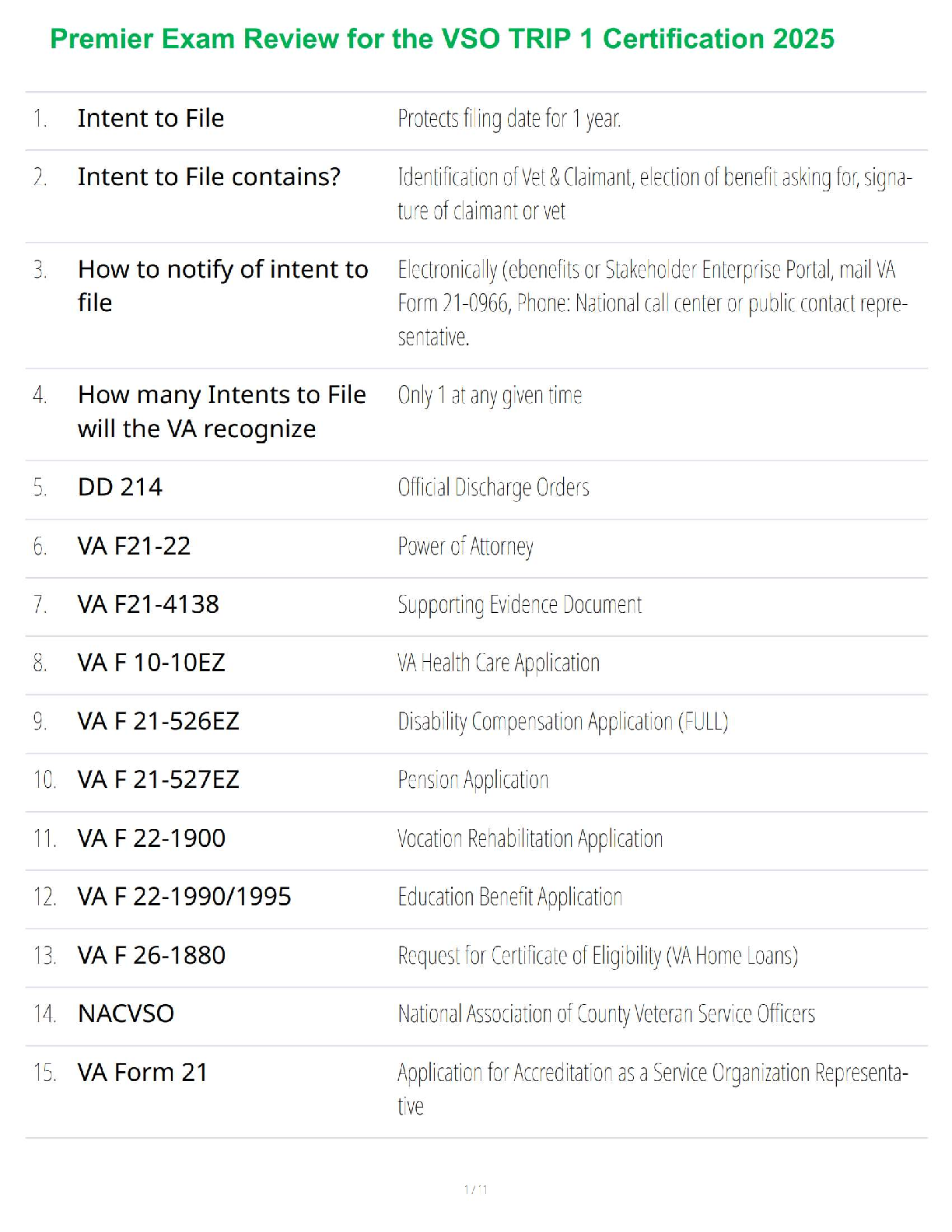 Prepare to ace the VSO TRIP 1 Certification exam with our premier review guide for the 2025/2026 academic year. This comprehensive resource provides a detailed Q&A format covering all essential topics, from 'Intent to File' procedures to critical VA forms like DD 214 and VA F 21-526EZ. Designed to streamline your study process, this guide ensures you grasp the core concepts needed to succeed. Stop worrying about resits and gain the confidence to pass your VSO certification on the very first try. Unlock your career as a certified Veteran Service Officer today!