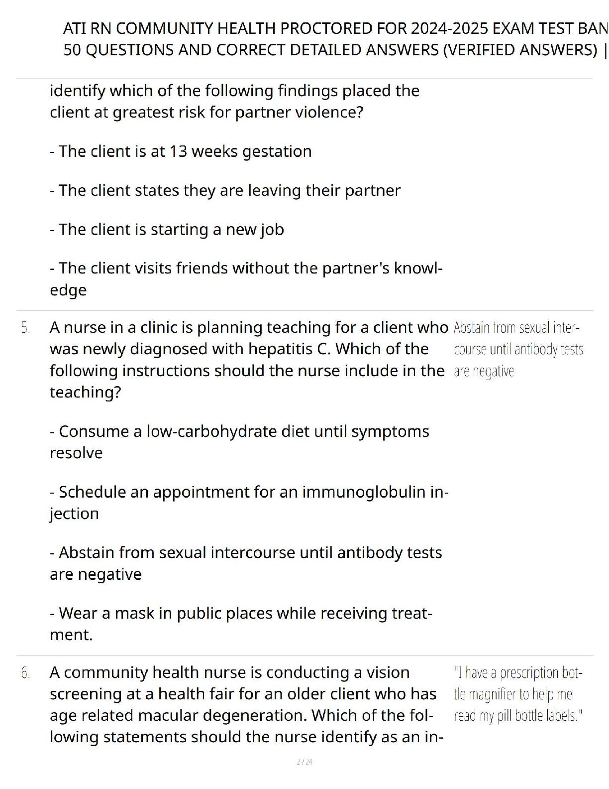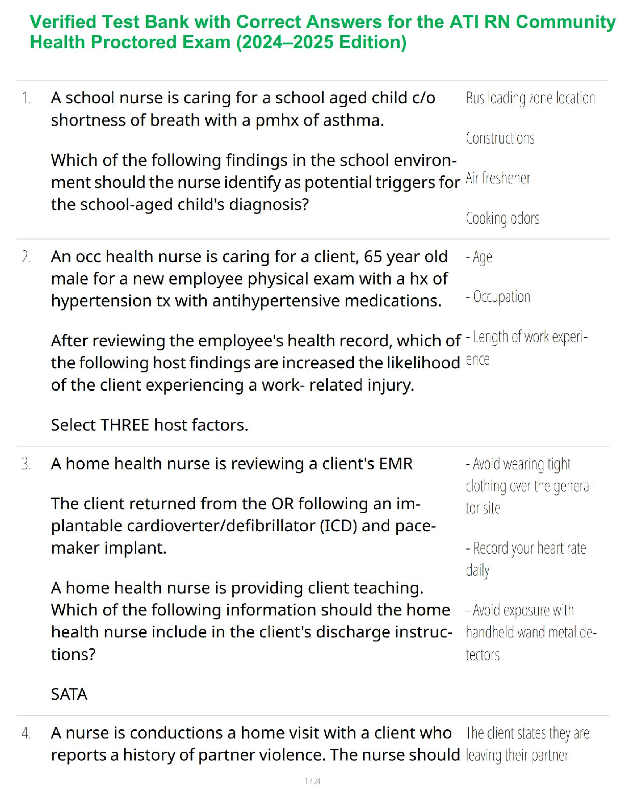 Master your ATI RN Community Health Proctored Exam with our comprehensive 2024-2025 Edition Test Bank. This essential study resource provides a full suite of verified questions and correct answers, meticulously designed by Assessment Technologies Institute (ATI) experts to mirror the actual proctored exam. Deepen your understanding of key community health nursing concepts and ensure you're fully prepared to excel. Ideal for nursing students aiming to pass their exams with high scores and avoid resits. Download now and take the first step towards acing your ATI certification.