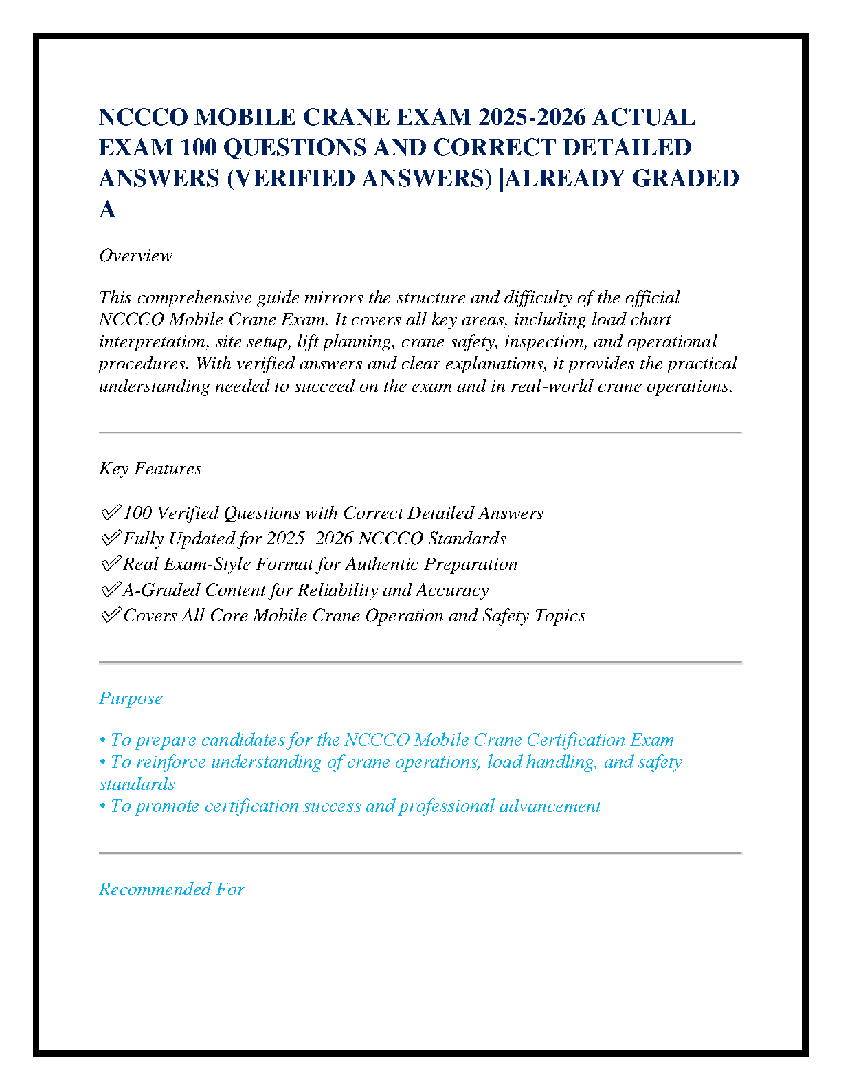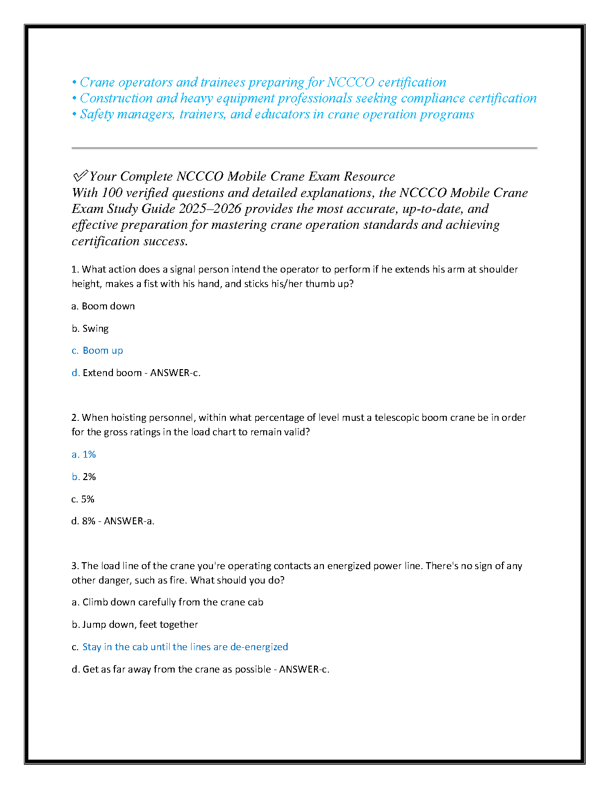 Ace your NCCCO Mobile Crane Operator certification on the first try with our premier 2025-2026 exam guide. This A-graded resource features 100 meticulously verified questions paired with in-depth, correct answers, designed to mirror the actual exam's format and difficulty. Master crucial topics such as load chart interpretation, site setup, lift planning, and crane safety. Fully updated to the latest 2025-2026 NCCCO standards, this guide provides the essential knowledge and confidence needed to pass your exam and excel in professional crane operations.