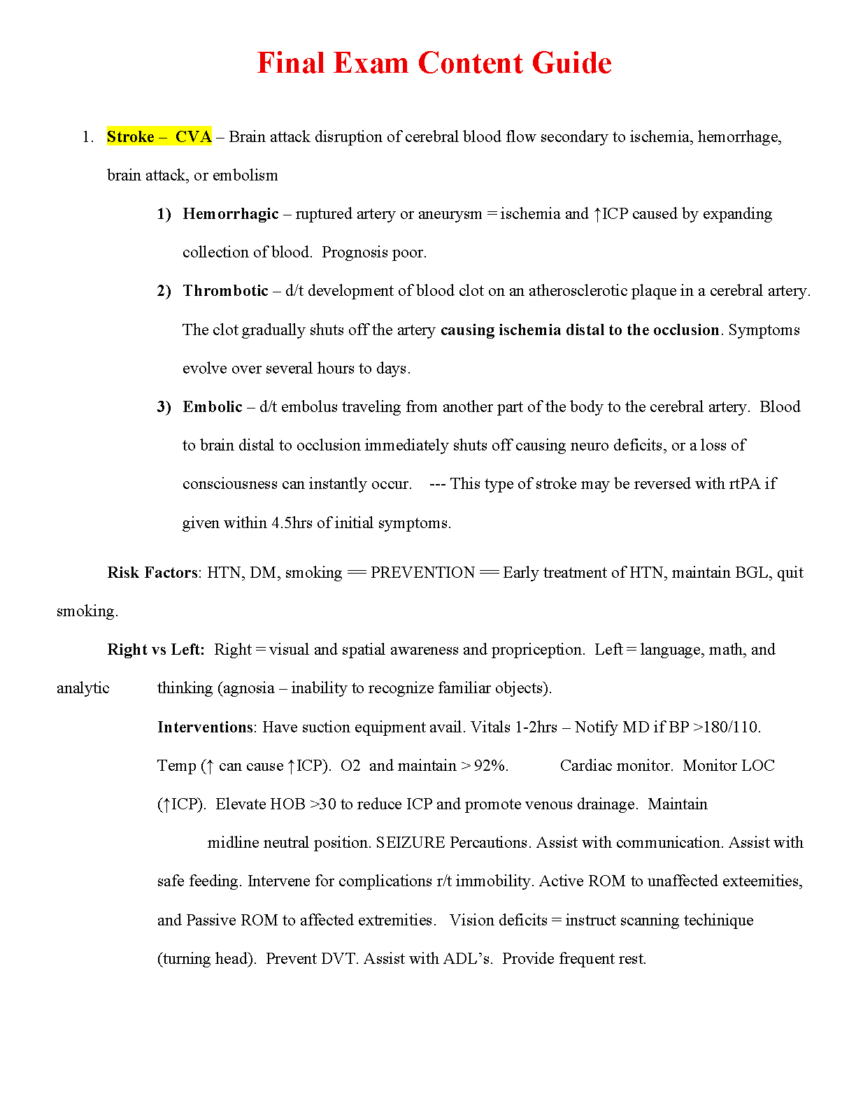 Ace your nursing finals with our updated 2025/2026 exam elaboration focused on Stroke (CVA). This essential study guide breaks down complex topics into easy-to-understand sections, covering the differences between hemorrhagic, thrombotic, and embolic strokes, key risk factors, and crucial nursing interventions for patient care. Learn to distinguish between right and left-sided stroke symptoms and master the protocols for a successful outcome. This guide is your ultimate tool to confidently pass your exams on the first try and avoid resits.