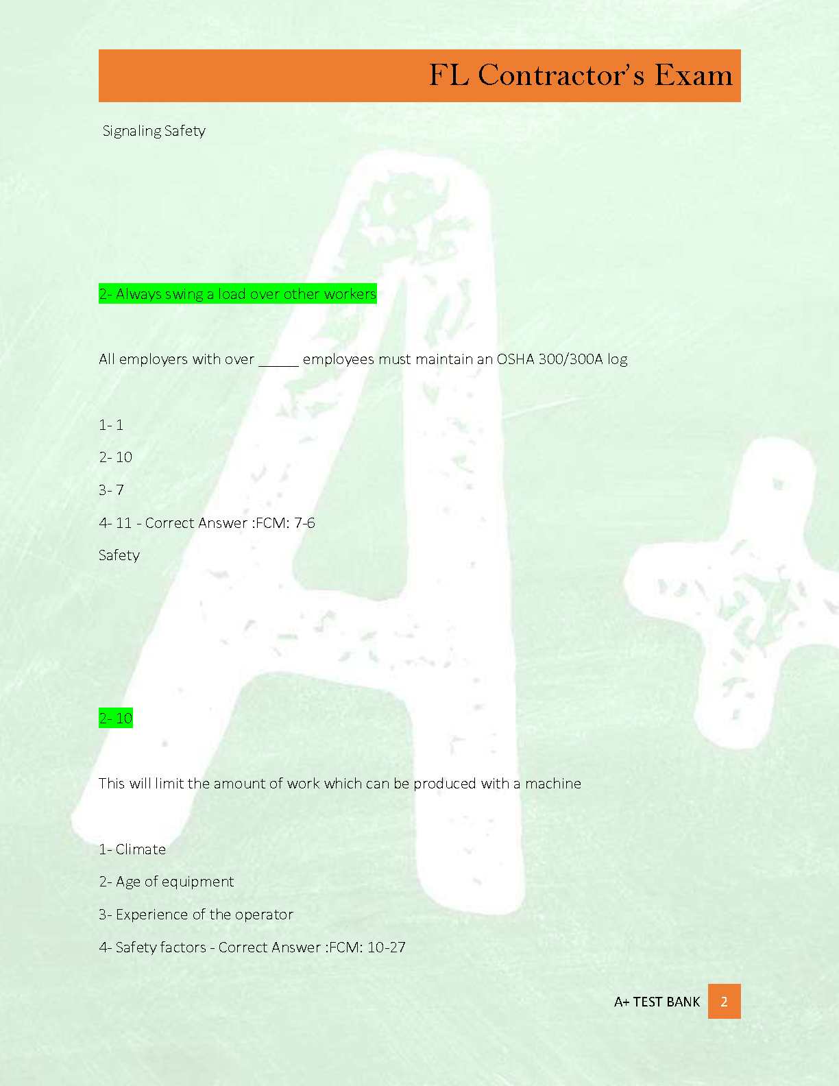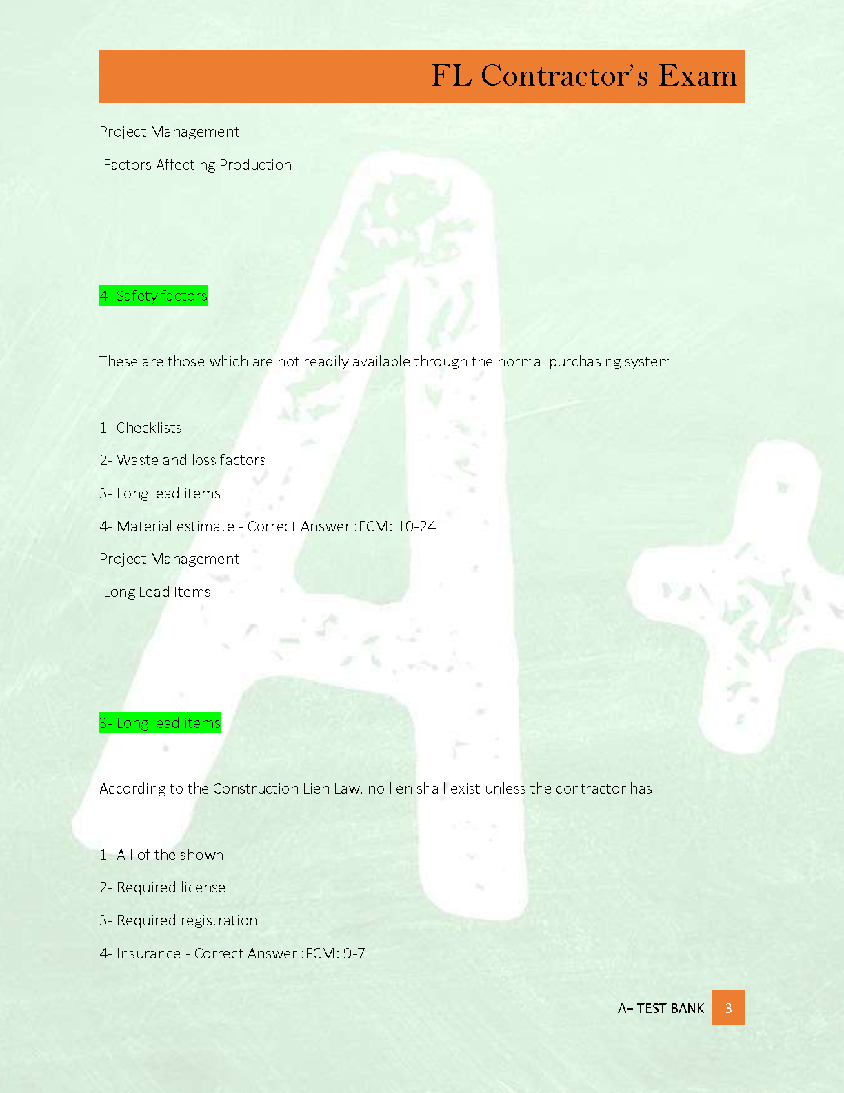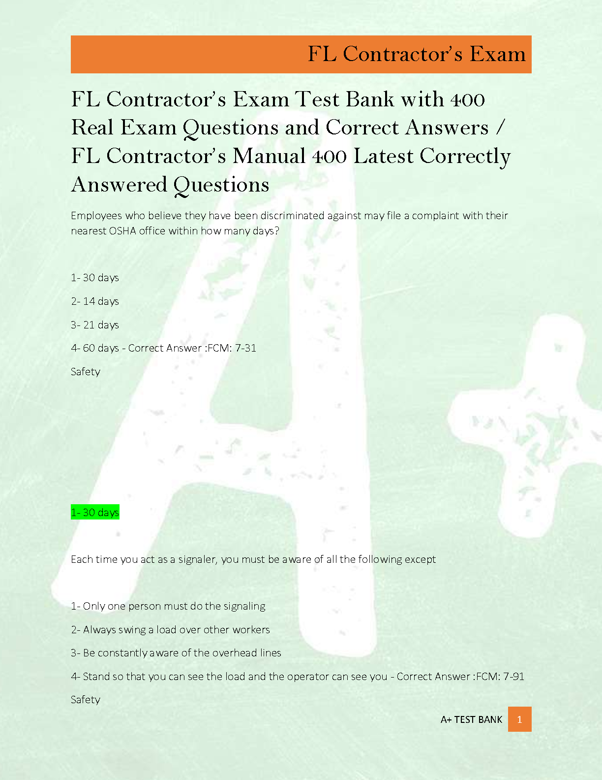 Ace your Florida Contractor's Licensing Exam with this comprehensive A+ Test Bank. This essential study guide features over 400 up-to-date, real exam questions complete with verified answers. Covering crucial topics directly from the FL Contractor's Manual, including safety regulations and OSHA standards, this resource is expertly designed to help you master the material. Prepare effectively, build your confidence, and pass your FL Contractor's Exam on the first try with these latest, correctly answered questions.