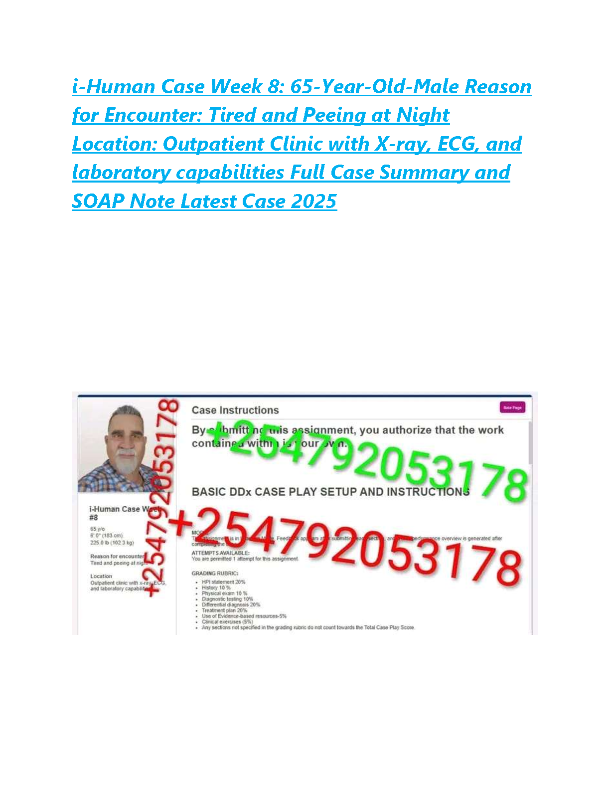 Ace your i-Human Week 8 assignment with this verified solution for the 65-year-old male patient presenting with fatigue and nocturia (tired and peeing at night). This guide, updated for the 2025/2026 academic year, includes a comprehensive Full Case Summary and a detailed SOAP Note. It's the perfect tool to help you master the case, secure a high grade, and pass your clinical simulation on the first try.