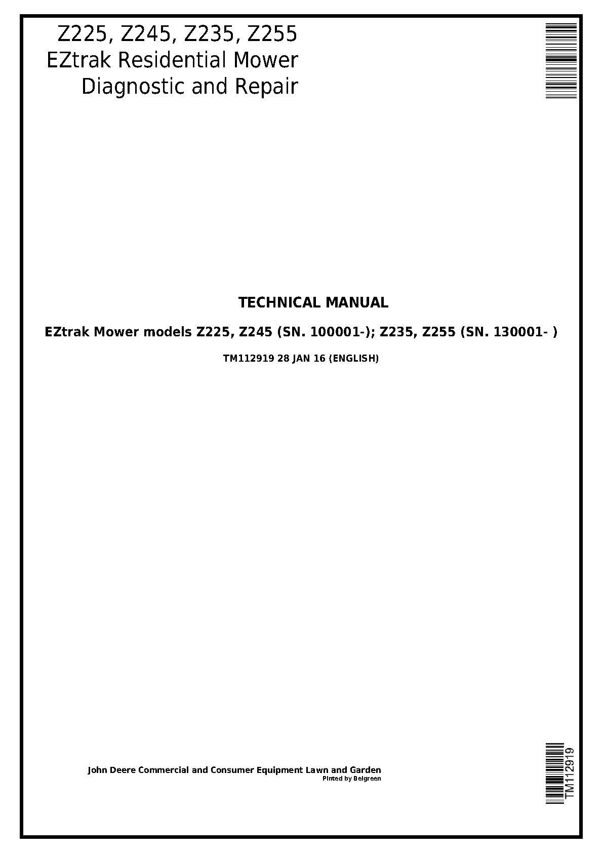 Get the complete official John Deere Technical Manual (TM112919) for EZtrak Residential Mower models Z225, Z245, Z235, and Z255. This comprehensive diagnostic and repair guide provides detailed, step-by-step instructions, high-quality diagrams, and wiring schematics to help you troubleshoot, service, and repair your lawn mower like a professional. Covers everything from basic maintenance to complex engine and electrical system repairs. An essential resource for DIY enthusiasts and professional technicians to keep your John Deere mower in top condition.