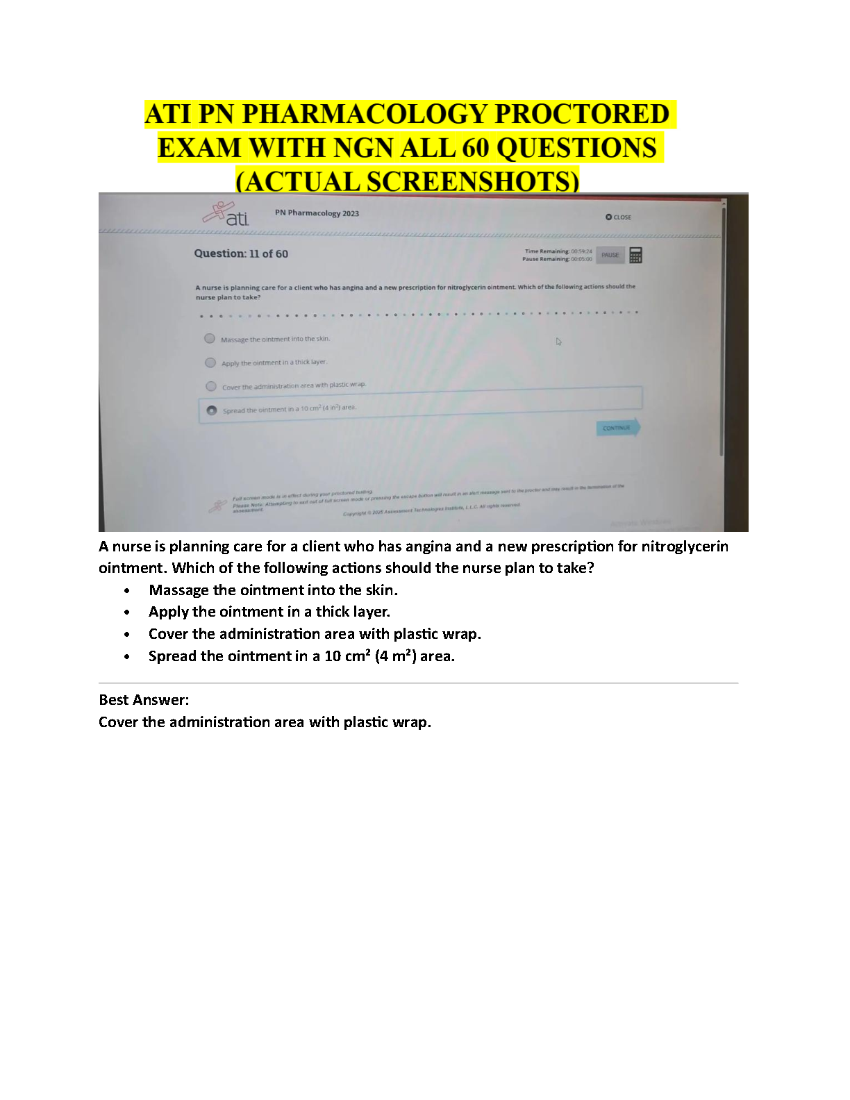 Ace your nursing pharmacology course with this ultimate study guide for the ATI PN Pharmacology Proctored Exam 2023. This comprehensive test bank includes all 60 actual exam questions, featuring the latest Next Generation NCLEX (NGN) formats. Each question is paired with a verified, correct answer, providing you with an accurate and reliable resource to master key concepts. Prepare with confidence, understand the material deeply, and pass your proctored exam on the first try with these authentic exam screenshots and solutions.