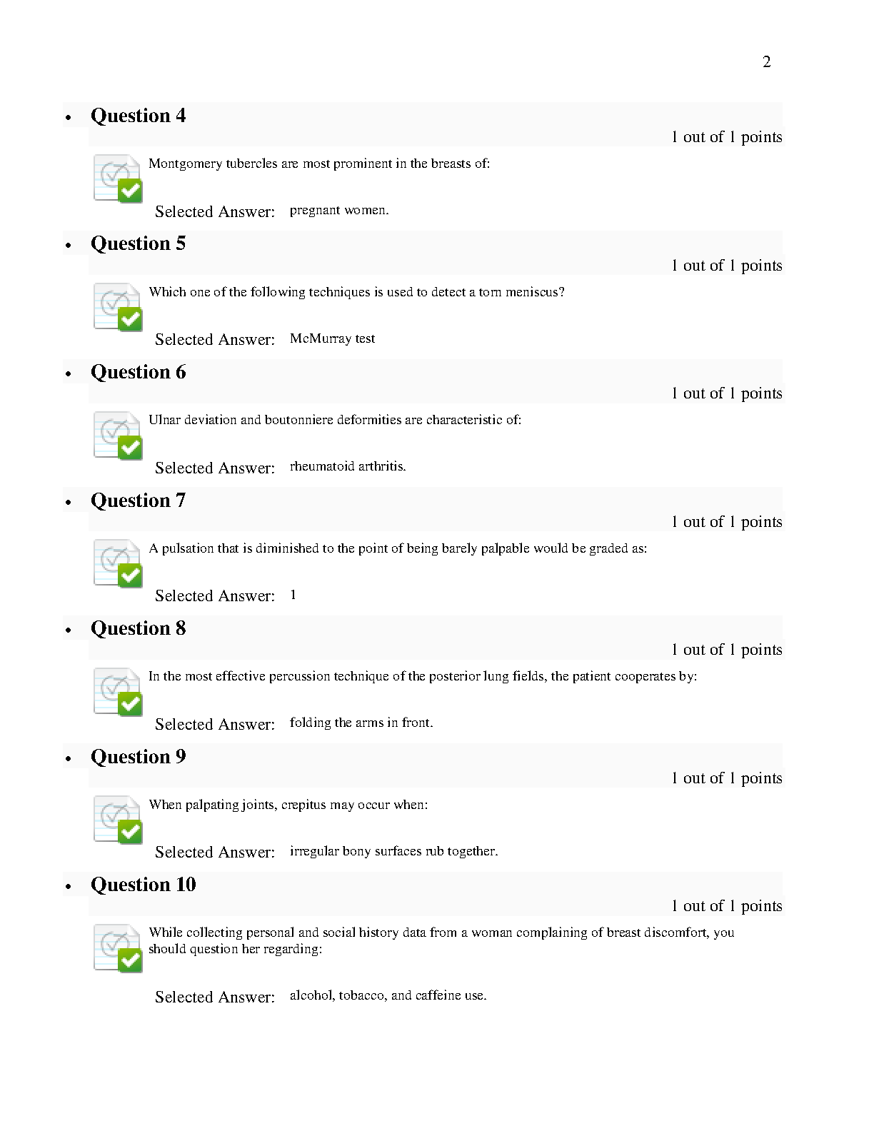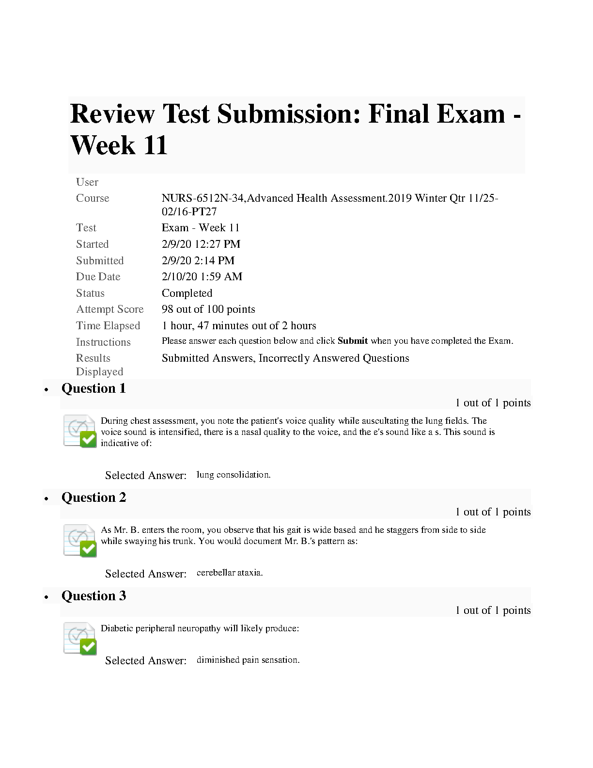 Excel in your NURS-6512N course with this verified test bank for the Week 11 Final Exam. Sourced directly from a 98/100 scored test, this study guide features authentic questions and correct answers aligned with 'Advanced Health Assessment & Clinical Diagnosis in Primary Care,' 6th Edition by Joyce E. Dains, Linda Ciofu Baumann, and Pamela Scheibel. This essential resource will help you master complex topics in patient assessment, diagnose conditions accurately, and confidently pass your final exam.