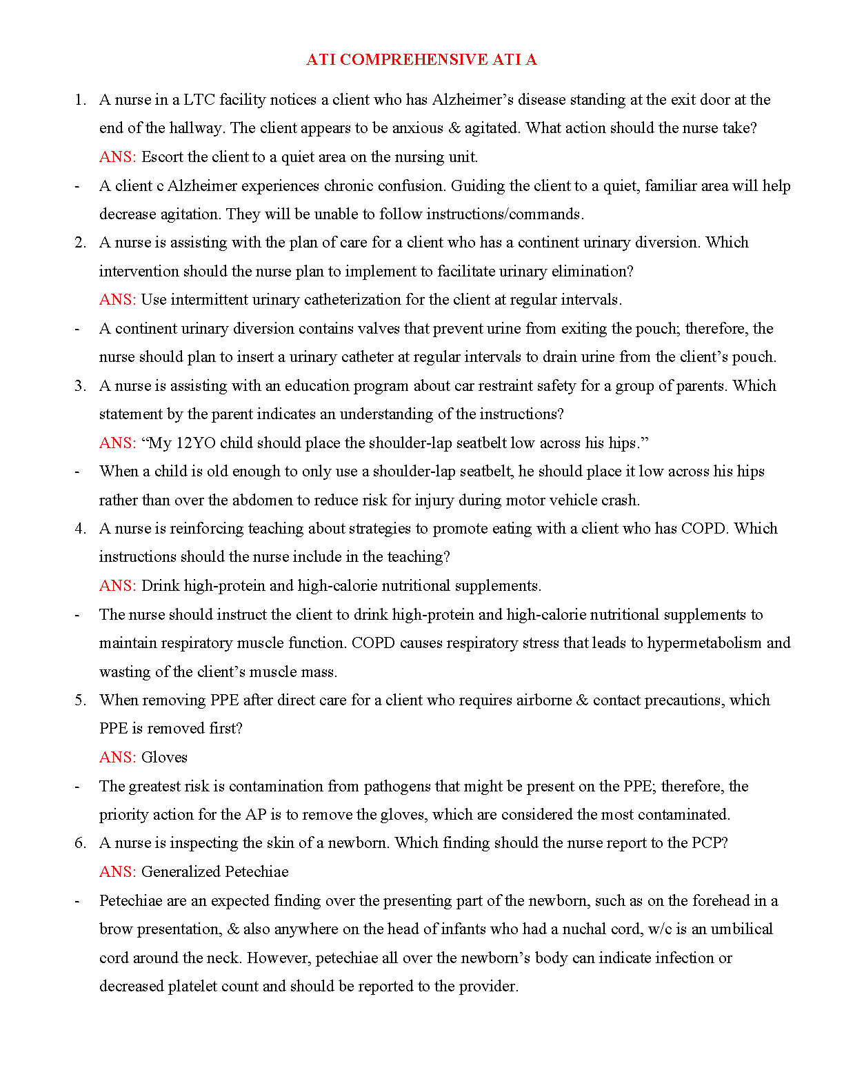 Unlock your potential and conquer the ATI Comprehensive Predictor exam with our latest 2025/2026 study guide! This resource features a curated collection of verified questions and detailed, easy-to-understand answers covering a wide range of essential nursing topics, including Alzheimer's care, urinary diversions, patient safety, COPD management, infection control (PPE), and newborn assessment. Each question is paired with a clear rationale to deepen your understanding and critical thinking skills. Stop worrying about resits and secure your success. This is the ultimate tool to help you study smarter, not harder, and pass your ATI Comprehensive A exam on the very first attempt.