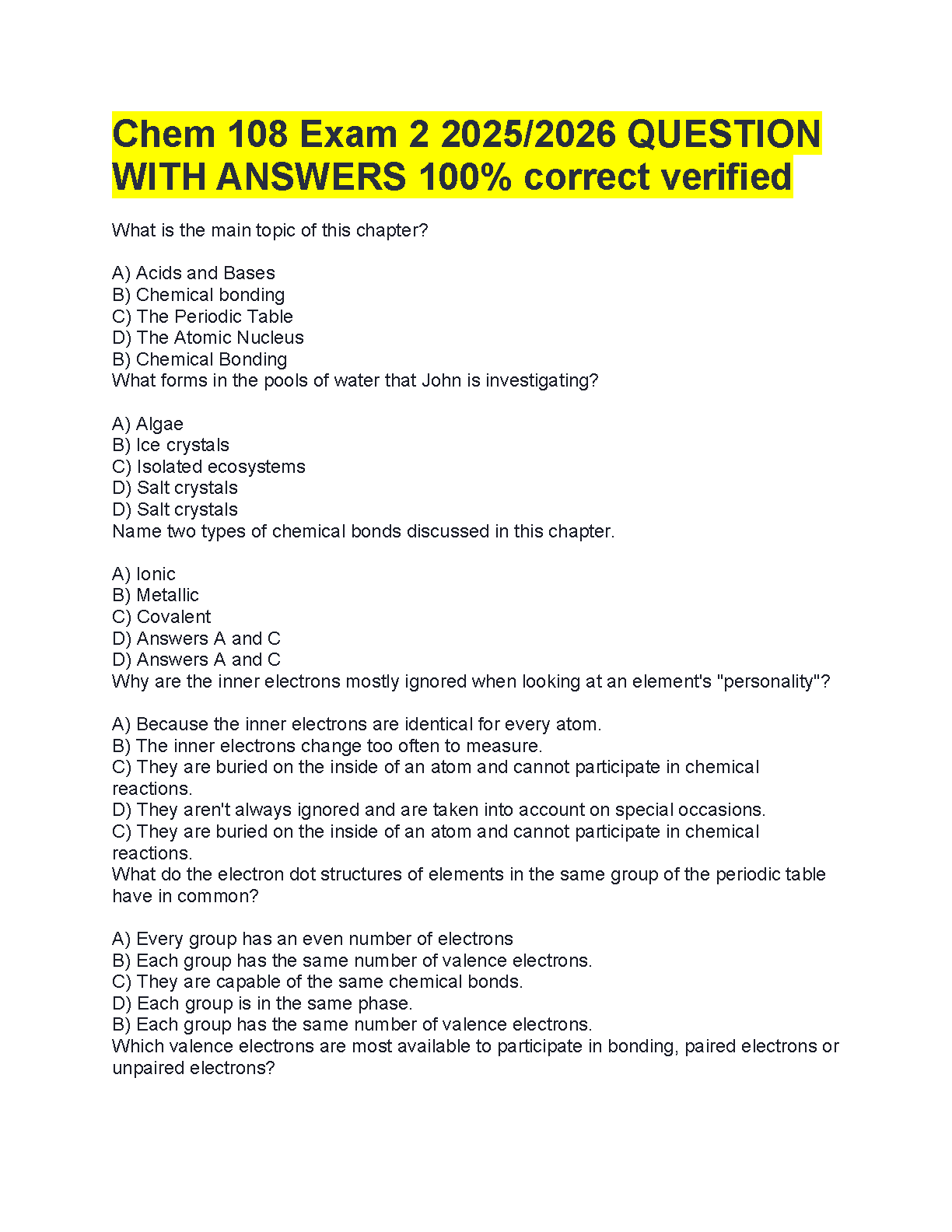 Master your General Chemistry course with our comprehensive Test Bank for Chem 108 Exam 2, fully updated for the 2025/2026 academic year. This essential study resource provides a complete set of exam-style questions paired with 100% correct, verified answers. Dive deep into crucial topics like chemical bonding, periodic trends, ionic and covalent bonds, and electron dot structures. Our test bank is meticulously designed to help you grasp complex concepts, practice effectively, and walk into your exam with confidence. Achieve a top grade and solidify your understanding of fundamental chemistry principles with this invaluable prep tool.