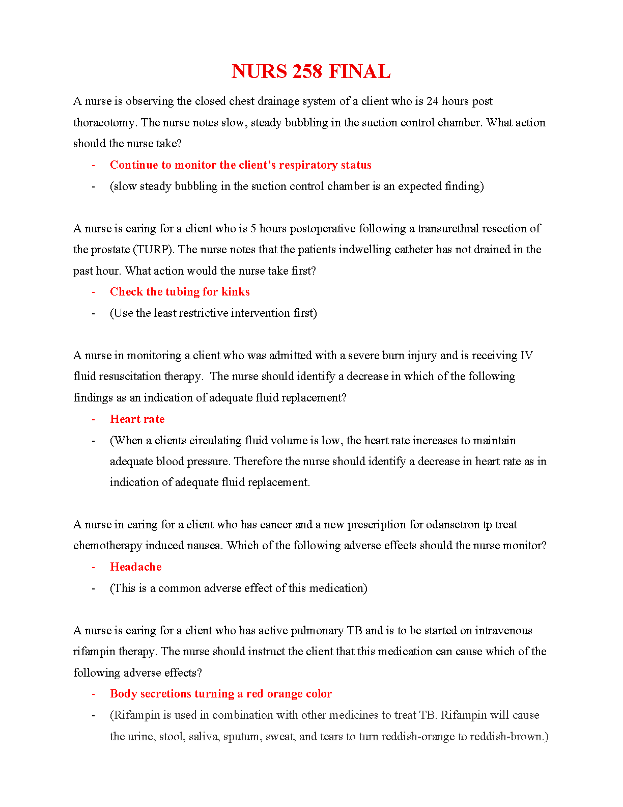 Prepare to excel in your NURS 258 Final Exam with our comprehensive and up-to-date study guide for the 2025/2026 academic year. This exam elaboration provides a detailed bank of questions and answers, each accompanied by a thorough rationale to deepen your understanding of core nursing concepts. This resource covers critical Med-Surg topics, including post-operative care (thoracotomy, TURP), fluid and electrolyte balance (burns), and pharmacology (ondansetron, rifampin). Our expertly crafted material is designed to boost your confidence, sharpen your clinical reasoning, and help you pass your final exam on the very first attempt. Download now and take the most effective step towards acing your NURS 258 course!