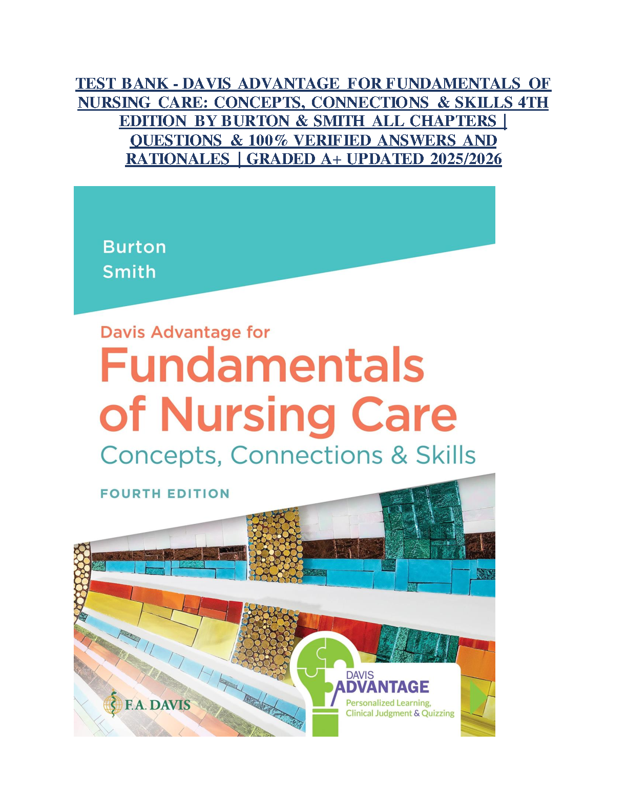 Master the core principles of nursing with the official Test Bank for 'Davis Advantage for Fundamentals of Nursing Care: Concepts, Connections & Skills, 4th Edition' by Marti Burton and Linda J. Smith. This invaluable, A+ graded resource covers all chapters and provides a complete collection of exam questions with 100% verified answers and detailed rationales. Each rationale clarifies the correct answer, enhancing your comprehension and clinical judgment skills. Updated for 2025/2026, this test bank is your key to acing your exams and succeeding in your nursing program.