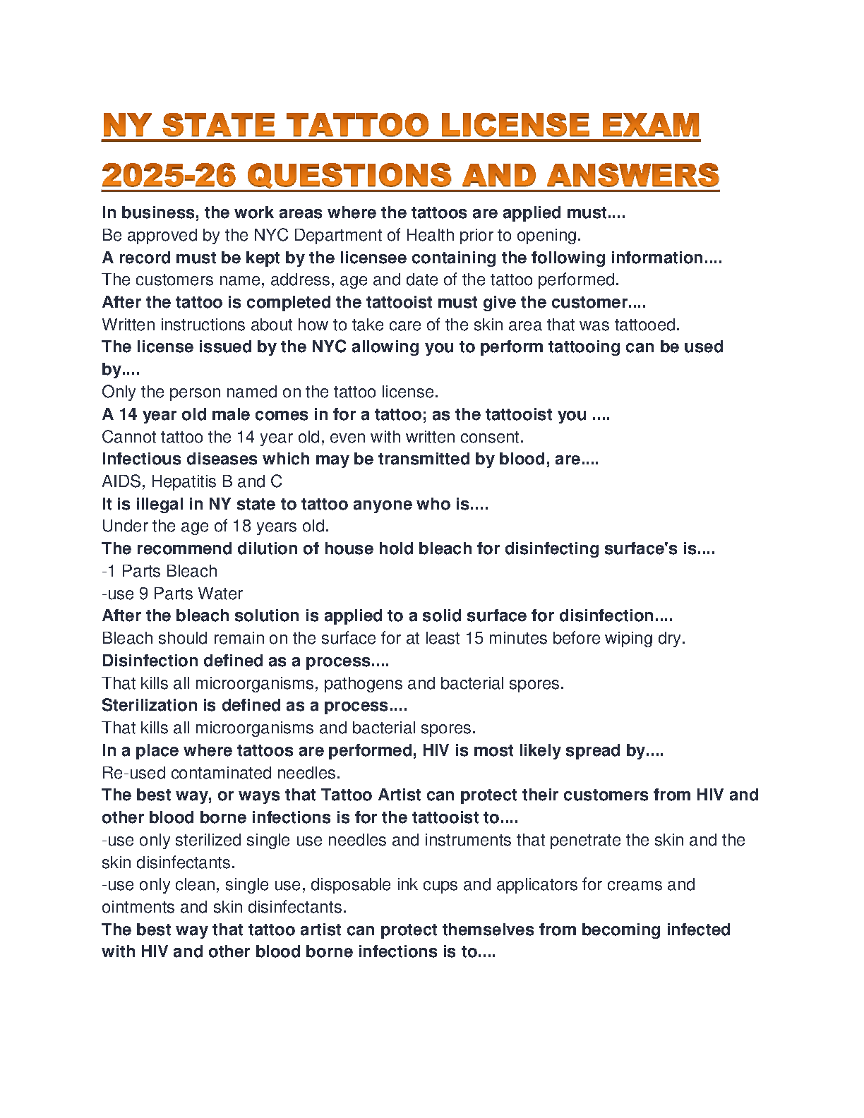 Get ready to ace your New York State Tattoo License Exam with our comprehensive 2025-2026 question and answer guide. This essential study resource covers all the critical topics you need to know, including NY state regulations, bloodborne pathogens (HIV, Hepatitis B & C), proper disinfection and sterilization procedures, age restrictions, and client safety protocols. Each question is paired with a direct, accurate answer to help you learn quickly and efficiently. Master the material, build your confidence, and ensure you pass your licensing exam on the very first attempt to kickstart your career as a professional tattoo artist.