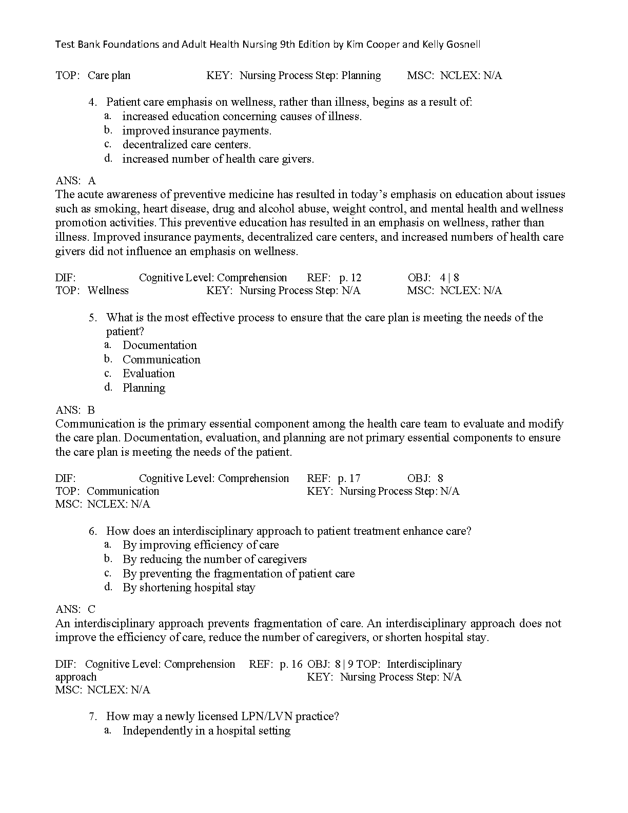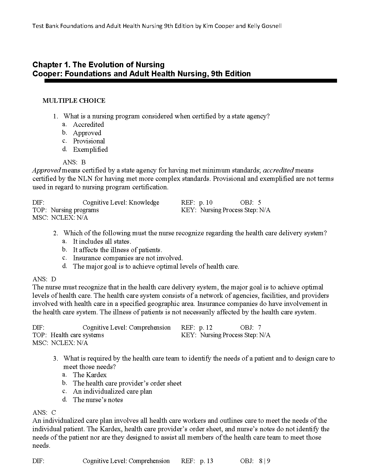Test Bank for Foundations and Adult Health Nursing, 9th Edition by Kim Cooper & Kelly Gosnell