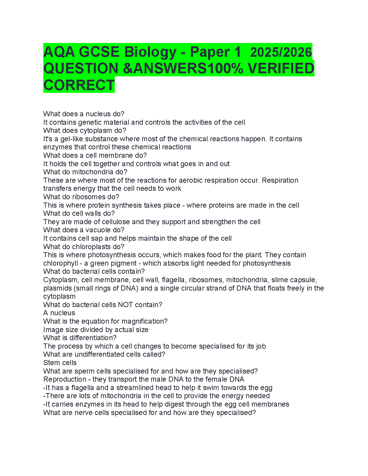 Unlock your full potential and secure a top grade in your AQA GCSE Biology Paper 1 exam with our latest 2025/2026 study guide. This comprehensive resource features a detailed set of verified questions and 100% correct answers, covering all essential topics from cell structure and function to specialisation. Designed to streamline your revision process, this guide provides the clarity and confidence you need to pass on your first attempt and avoid costly resits. Get the ultimate tool for exam success!