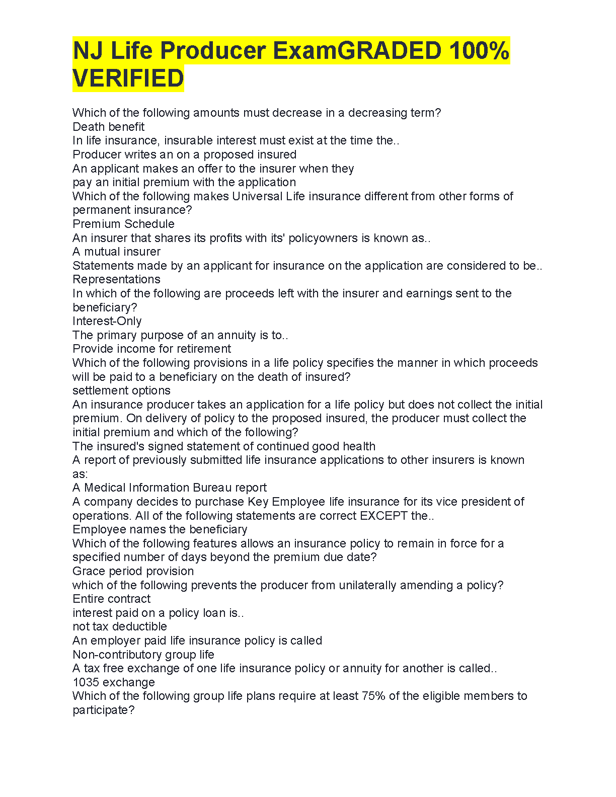 Get ready to ace your New Jersey Life Producer Exam with our latest 2025/2026 test bank! This all-inclusive study guide is your key to passing on the very first attempt. Inside, you'll find a meticulously compiled collection of exam questions paired with 100% verified and graded answers, covering all essential topics. From the fundamentals of life insurance policies and annuities to complex subjects like policy provisions, settlement options, and insurable interest, we've got you covered. This resource is expertly designed to familiarize you with the actual exam format, boost your confidence, and eliminate the stress of resits. Unlock your career potential and become a certified NJ Life Producer with this essential preparation tool.