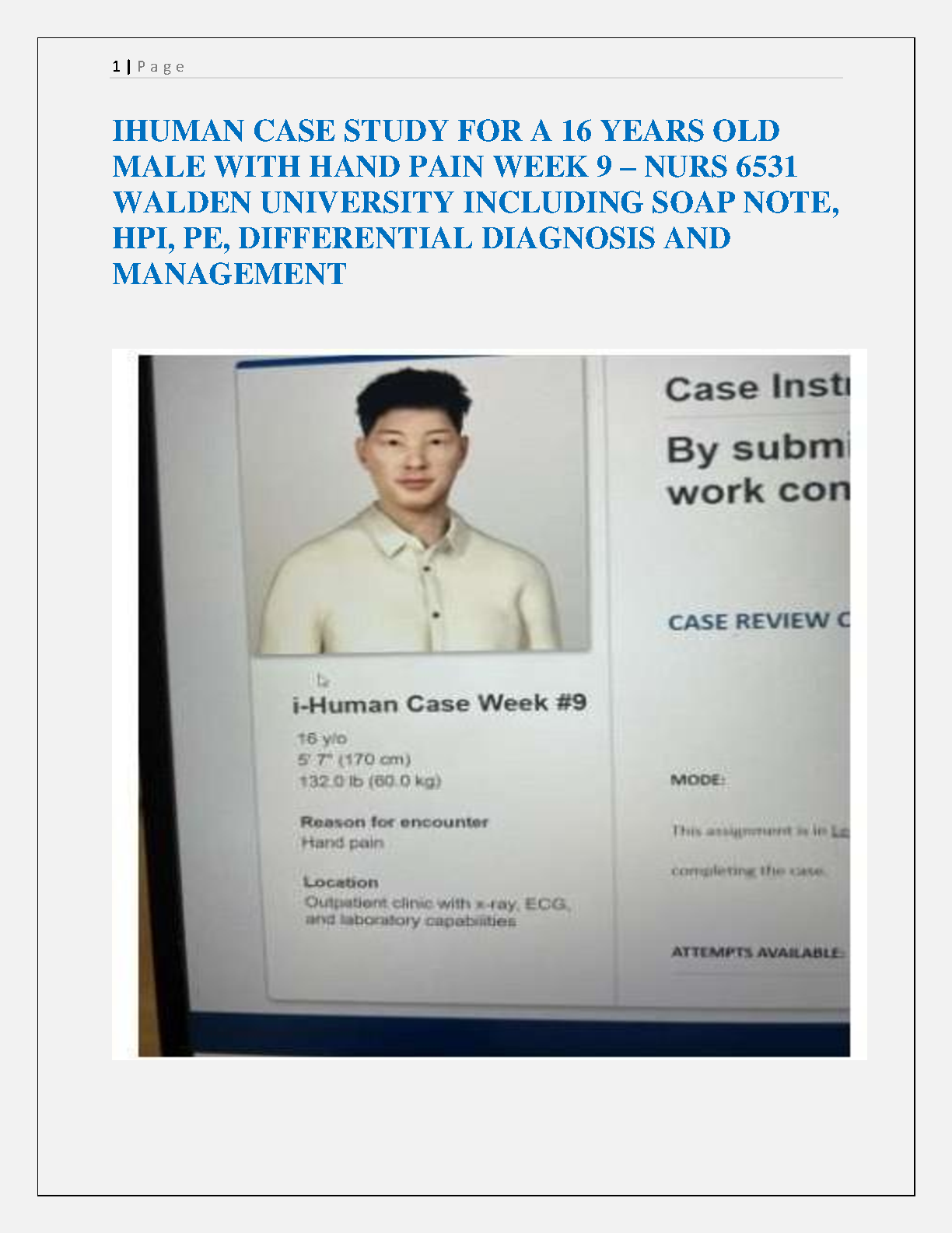 Excel in your NURS 6531 course at Walden University with this comprehensive i-Human Week 9 Case Study. This guide focuses on a 16-year-old male patient with a chief complaint of hand pain. It provides a detailed breakdown including the SOAP note, History of Present Illness (HPI), Physical Examination (PE), differential diagnosis, and a complete management plan. This newly updated 2025/2026 resource is your key to achieving a top grade and ensuring you pass your exams confidently on the first try.