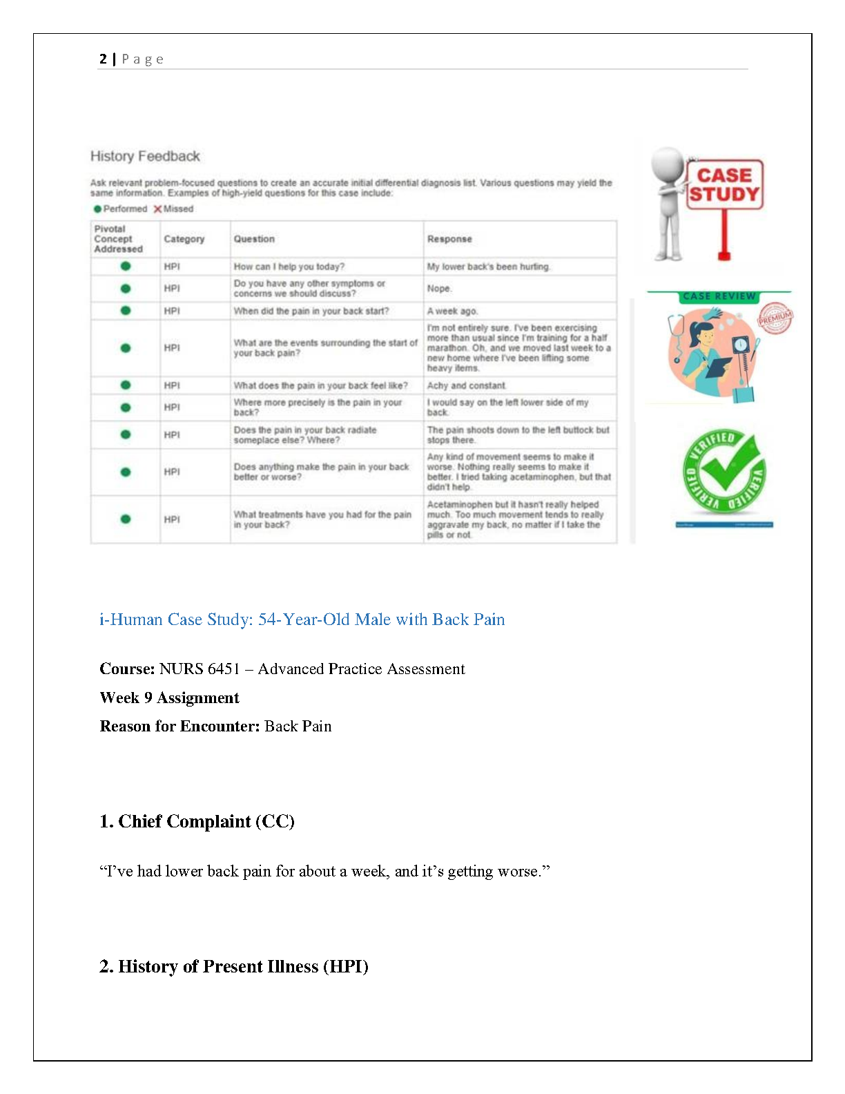 Unlock exam success with our comprehensive guide to the i-Human Week 9 case study featuring a 54-year-old male presenting with back pain. This updated 2025/2026 resource provides a complete, step-by-step analysis, including a detailed History of Present Illness (HPI), Physical Examination (PE) findings, a full list of Differential Diagnoses, and a thorough Management Plan. Ace your simulations and pass your exams on the first try with this essential study aid.